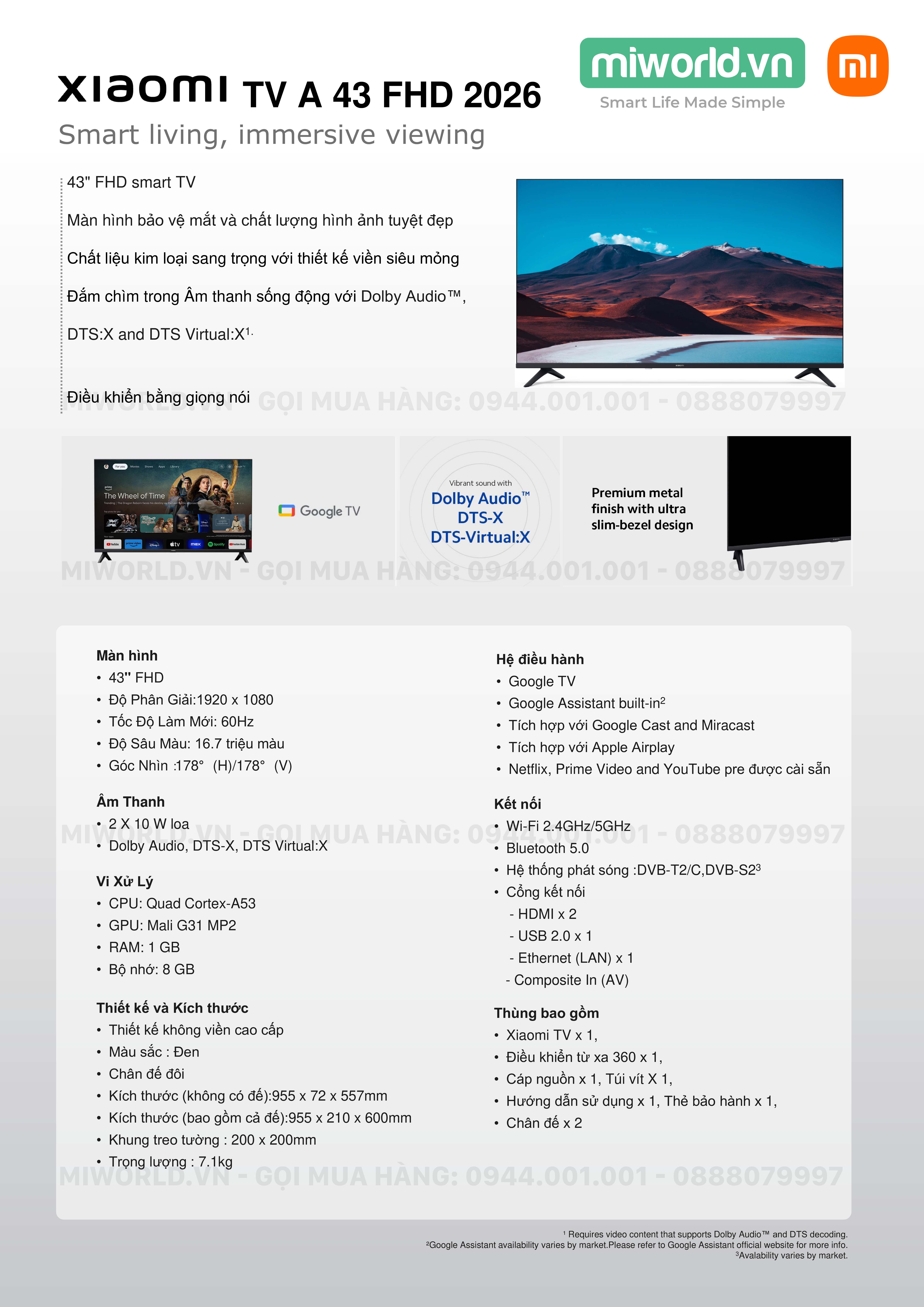 Bạn đang tìm kiếm một chiếc Smart TV 43 inch Full HD với thiết kế hiện đại, hình ảnh sắc nét và âm thanh sống động? Xiaomi TV A 43 FHD 2026 chính là lựa chọn hoàn hảo với công nghệ Dolby Audio™, DTS:X, hệ điều hành Google TV, giúp bạn tận hưởng những phút giây giải trí trọn vẹn.