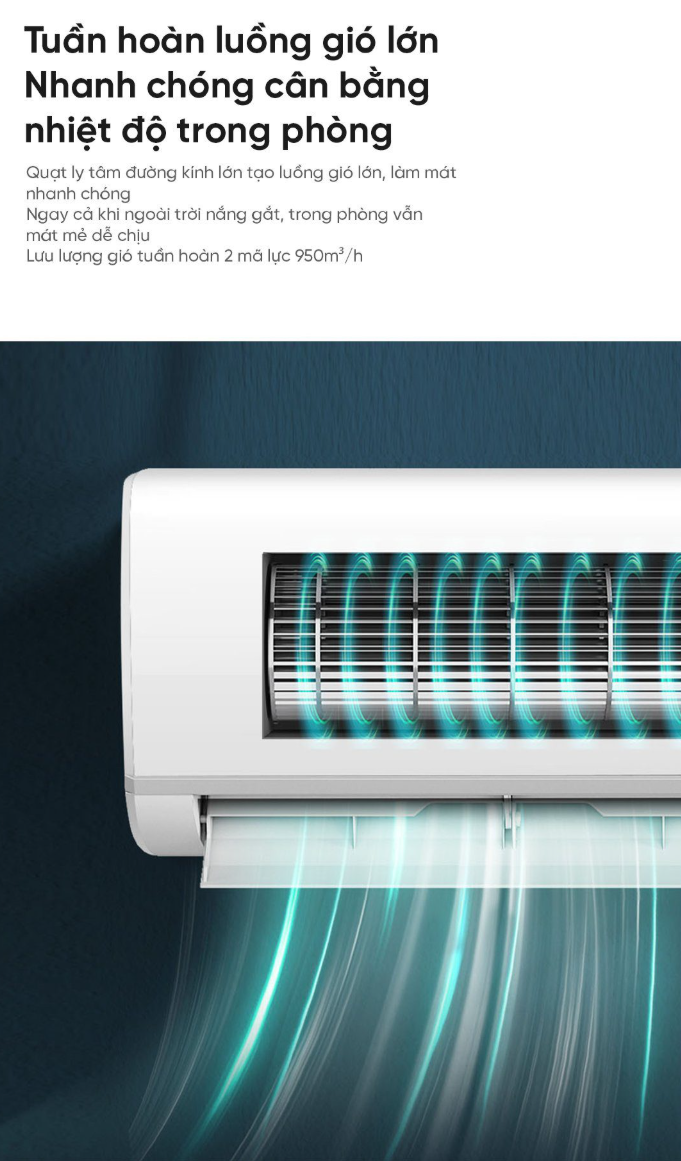 - Tuần hoàn gió lớn và cân bằng ẩm: Lưu lượng gió 950m³/h giúp làm mát/sưởi đều khắp phòng. Công nghệ kiểm soát nhiệt độ và độ ẩm thông minh, tránh khô da hoặc ẩm mốc.
