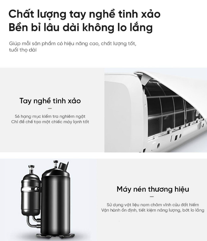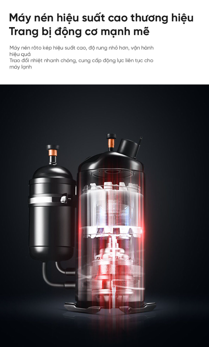 - Công nghệ biến tần DC toàn phần và máy nén thương hiệu cao cấp: Giúp vận hành ổn định, giảm rung lắc, tiết kiệm năng lượng và kéo dài tuổi thọ máy.