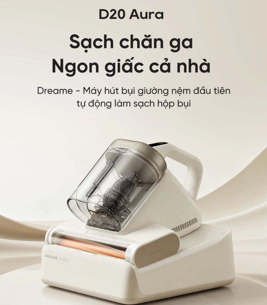 Máy hút bụi giường nệm Dreame D20 Aura – Siêu phẩm diệt khuẩn UV, lực hút 16.000Pa, sấy khí nóng 3D 70°C, tự động đổ bụi 150 ngày. Đây là máy hút bụi giường nệm đầu tiên của Dreame tích hợp trạm đổ rác tự động, mang đến giải pháp làm sạch sâu, khử khuẩn và giữ hương thơm cho giường ngủ, nệm, ghế sofa – giúp cả gia đình có giấc ngủ ngon và sạch sẽ hơn.