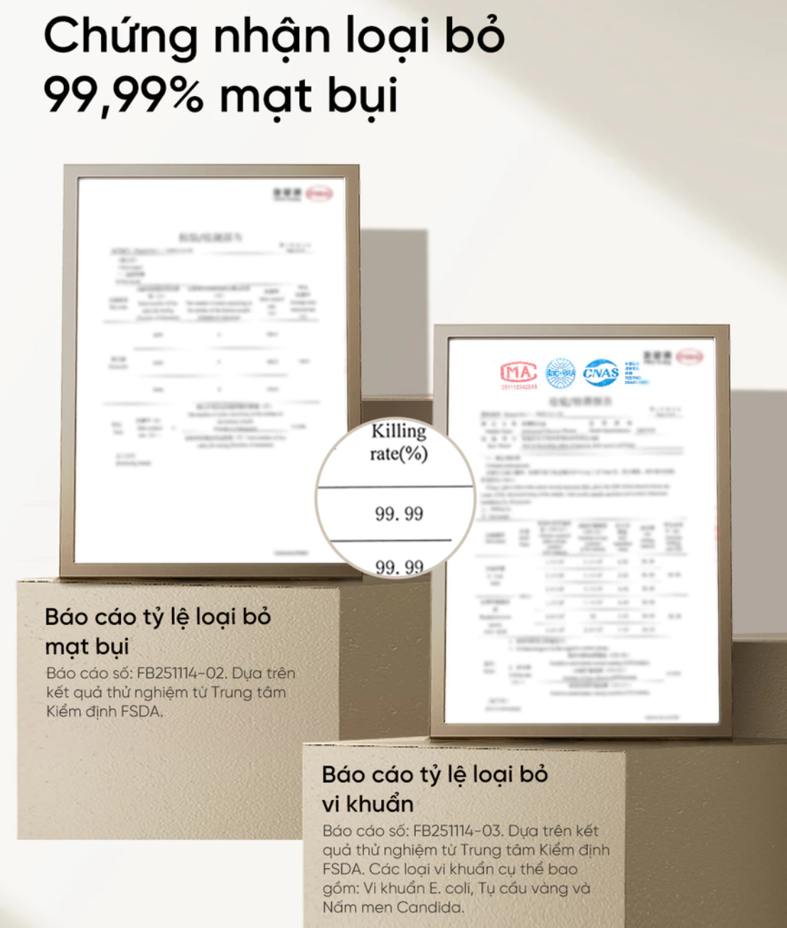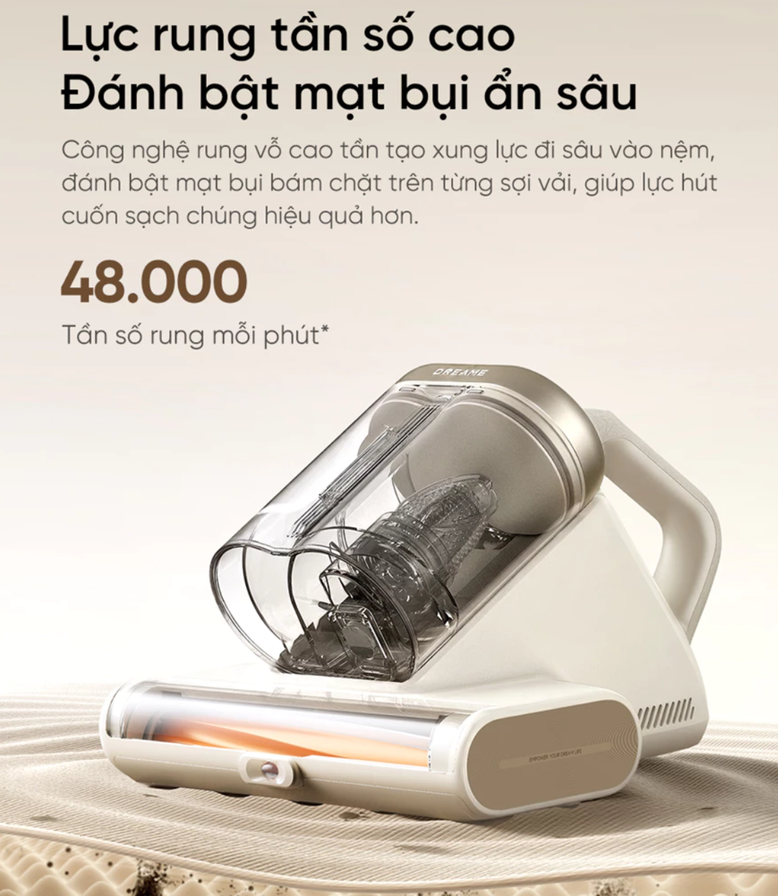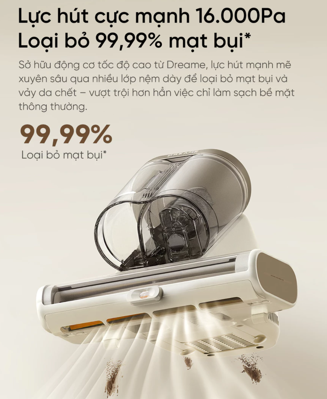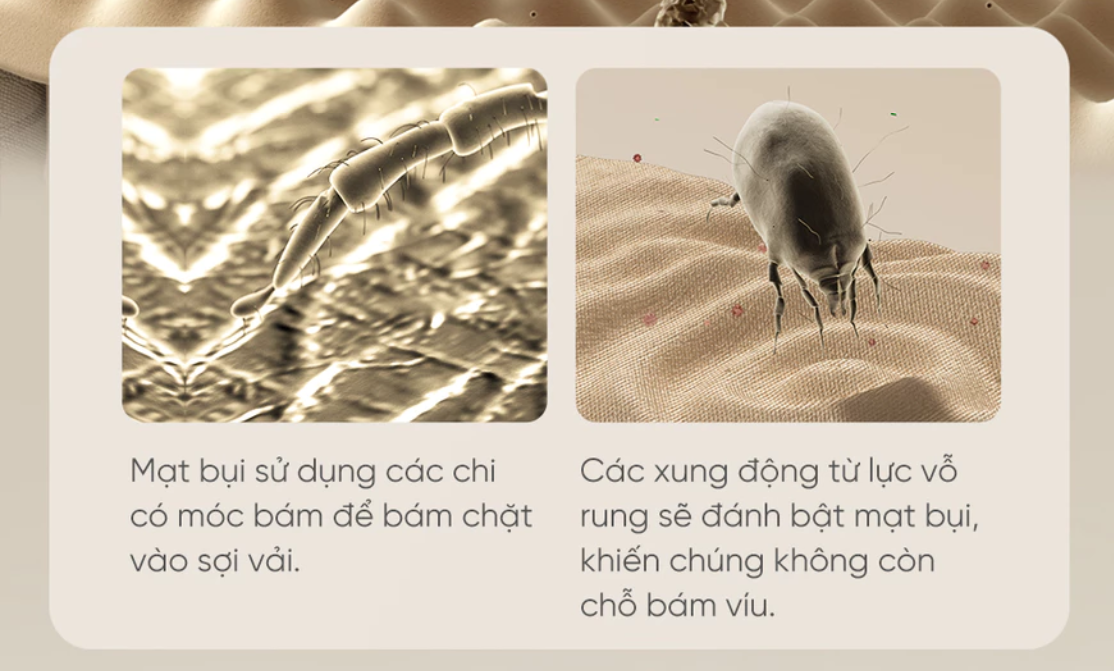 - Lực hút siêu mạnh 16.000 Pa + rung tần số cao Động cơ mạnh mẽ kết hợp rung 48.000 lần/phút đánh bật mạt bụi, vảy da chết bám sâu trong nệm. Hiệu quả loại bỏ 99,99% mạt bụi (có chứng nhận kiểm định).