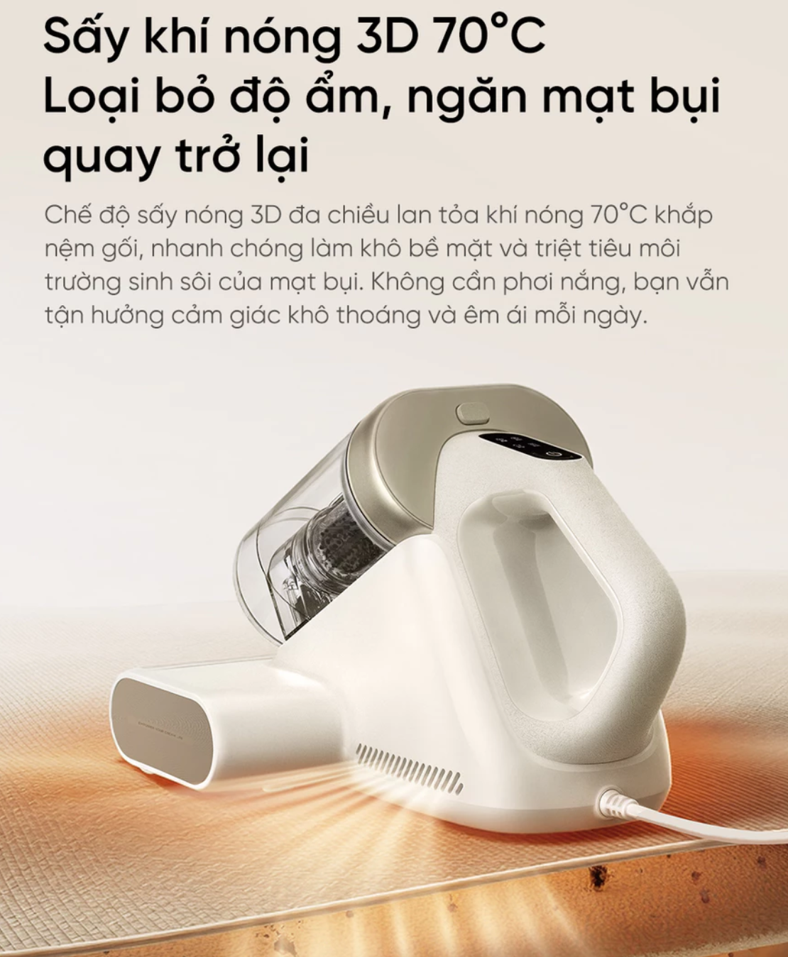 - Diệt khuẩn UV + Sấy khí nóng 3D 70°C Tia UV tiêu diệt vi khuẩn (E.coli, Staphylococcus aureus…) bằng bước sóng 253.7nm. Khí nóng 70°C lan tỏa đa chiều, loại bỏ độ ẩm, ngăn mạt bụi quay lại và diệt nấm mốc mà không cần phơi nắng.