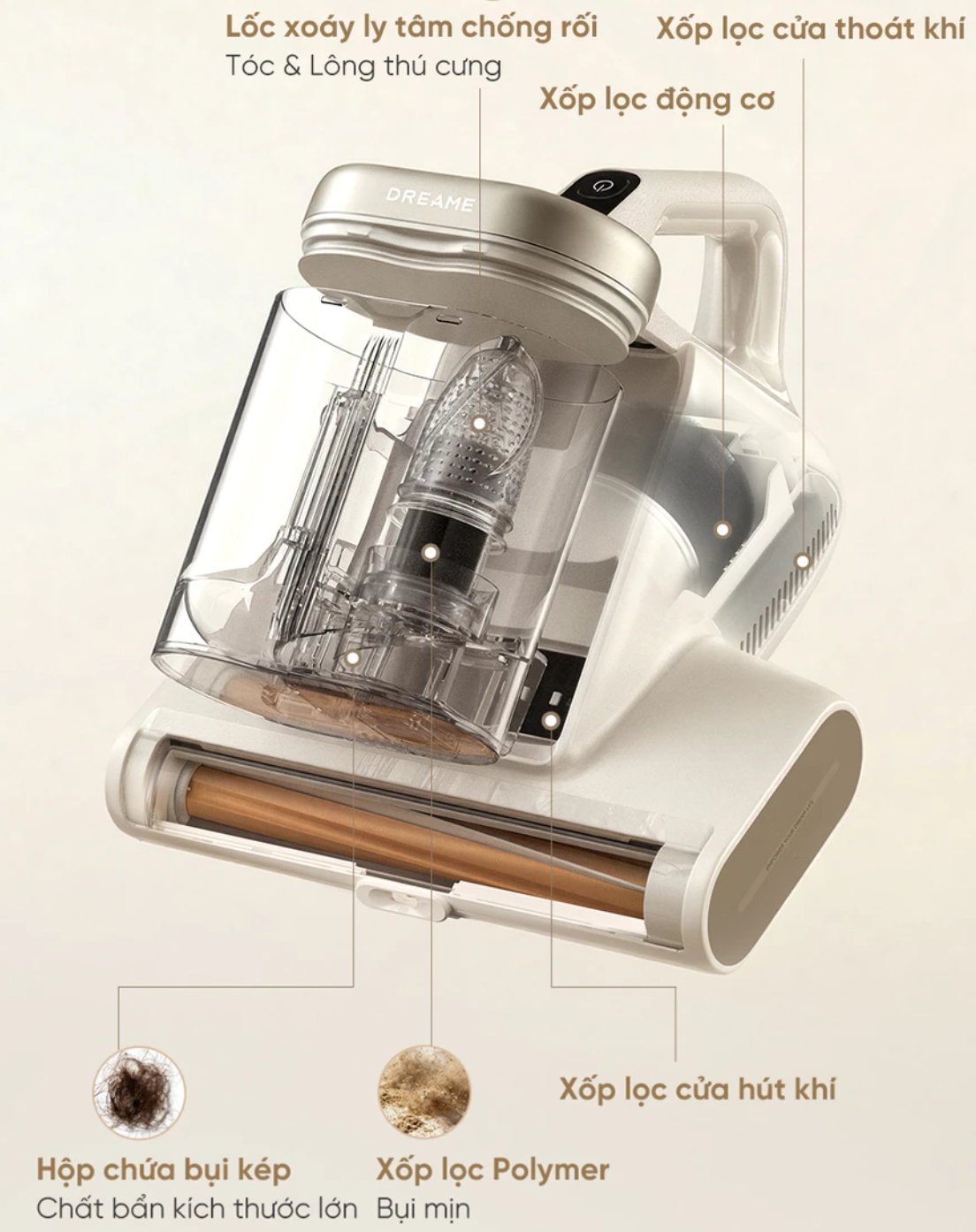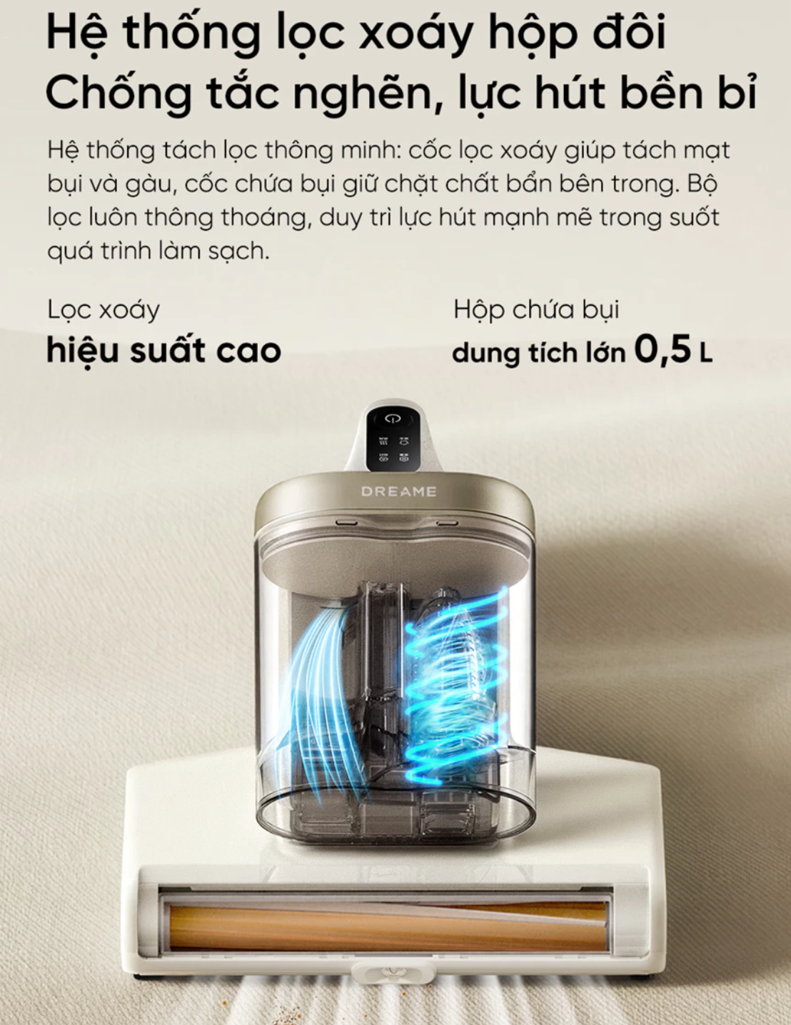 Với công nghệ hiện đại, Dreame D20 Aura không chỉ hút bụi bề mặt mà còn đánh bật mạt bụi, vảy da chết, tóc/lông thú cưng ẩn sâu trong từng sợi vải, đồng thời diệt khuẩn bằng tia UV và sấy khô để ngăn ngừa nấm mốc.