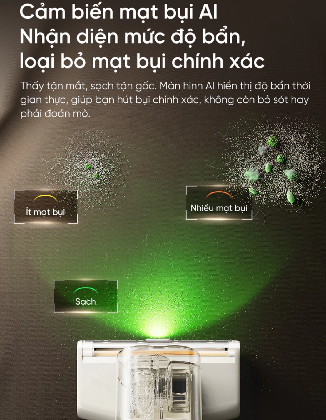 - Cảm biến AI thông minh Nhận diện mức độ bẩn thời gian thực, tự điều chỉnh lực hút phù hợp, hiển thị trực quan trên màn hình (Ít bẩn – Nhiều bẩn – Sạch).