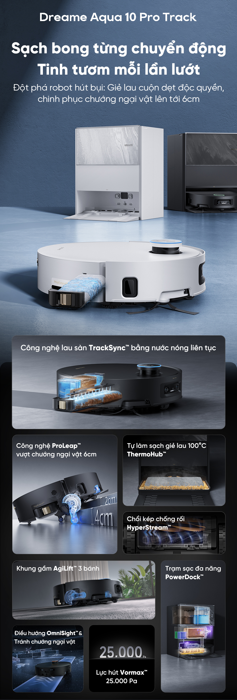 Robot Hút Bụi Lau Nhà Dreame Aqua 10 Pro Track – Hàng Chính Hãng, một trong những siêu phẩm được mong chờ nhất năm 2025. Sở hữu loạt công nghệ tiên tiến như TrackSync™, AstroVision™, Hyperstream™ Duo Brush và lực hút siêu mạnh lên đến 25.000Pa,