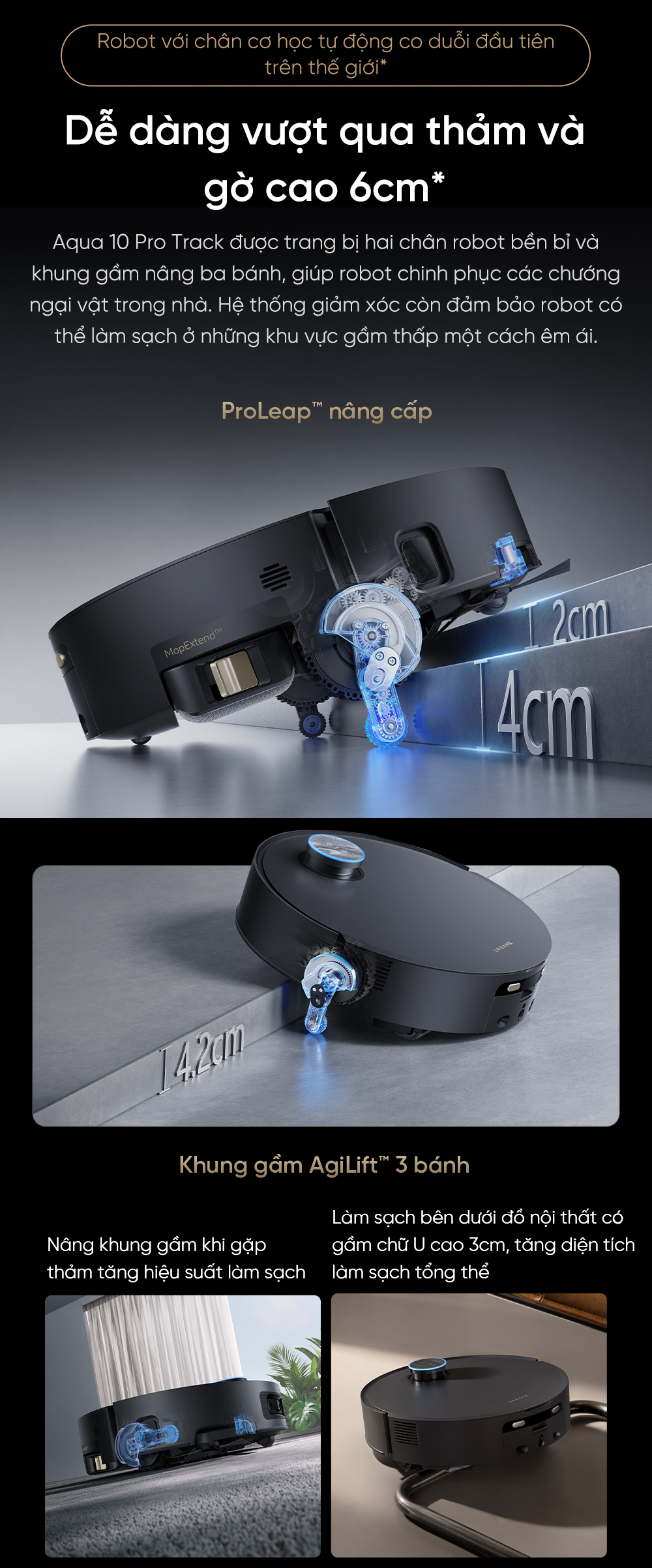 Nhờ hệ thống khung gầm Triple Wheel AgiLift™ Chassis cùng khả năng leo vật cản lên tới 6cm, Dreame Aqua 10 Pro Track có thể dễ dàng di chuyển qua thảm, bậc cửa, gờ gạch… một cách mượt mà mà không bị mắc kẹt. Gọi mua hàng: 0888079997