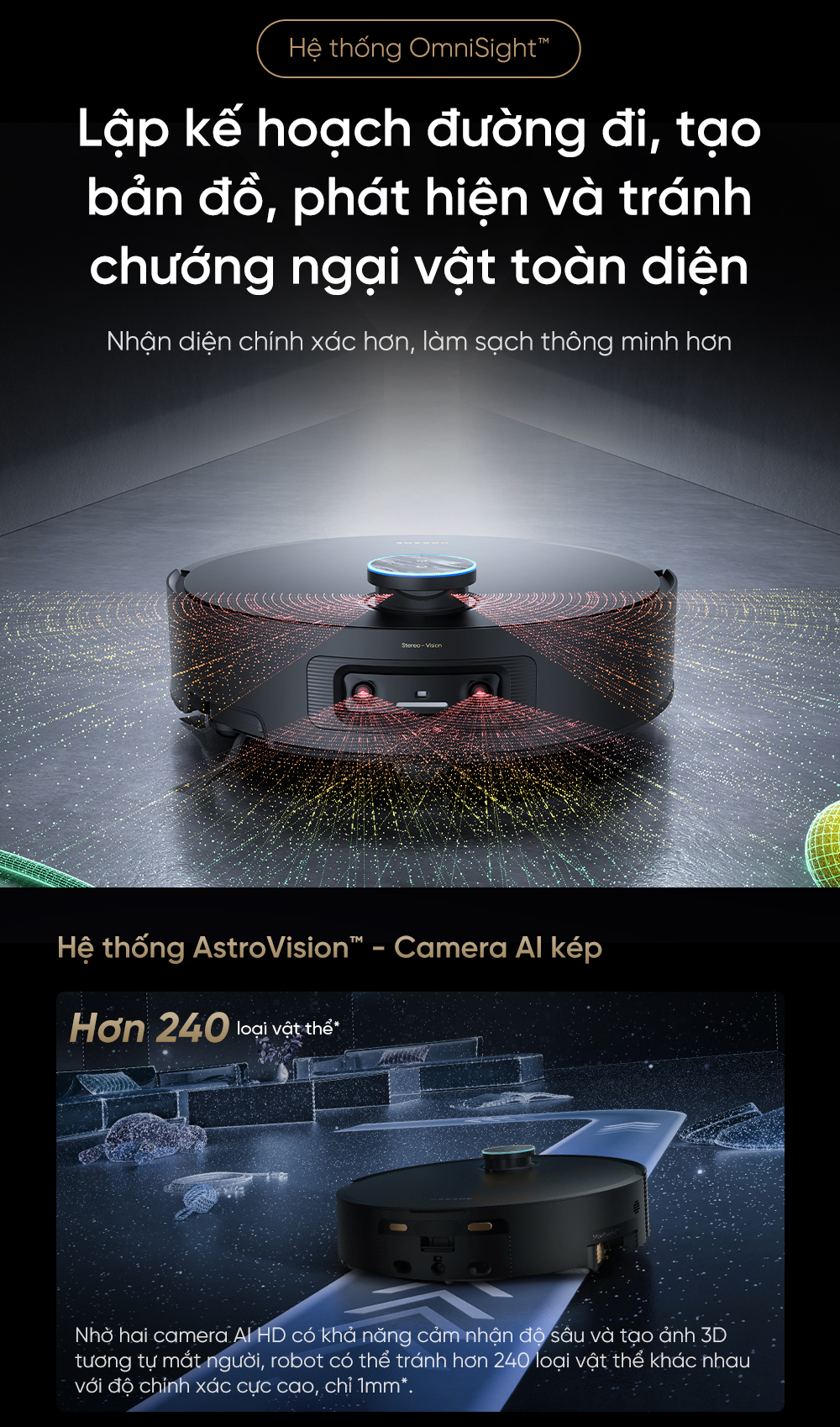 Dreame Aqua 10 Pro Track sử dụng AstroVision™ Navigation – công nghệ điều hướng tân tiến mô phỏng theo cảm biến thiên văn học. Nhờ đó, robot nhận diện không gian chính xác, lập bản đồ nhanh chóng và di chuyển thông minh, hạn chế va chạm hoặc bỏ sót khu vực làm sạch.