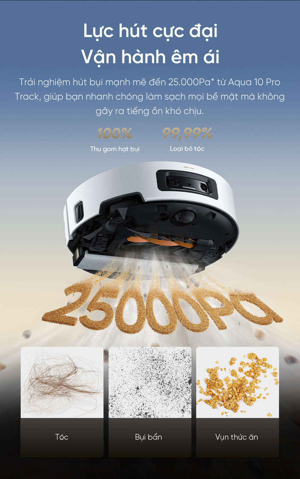 Với lực hút cực đại 25.000Pa, Dreame Aqua 10 Pro Track dễ dàng hút sạch mọi loại bụi mịn, tóc, lông thú cưng, mảnh vụn thức ăn và các loại rác lớn nhỏ khác. Hiệu quả đặc biệt khi làm sạch thảm, sàn gỗ, gạch men hay nền bê tông.