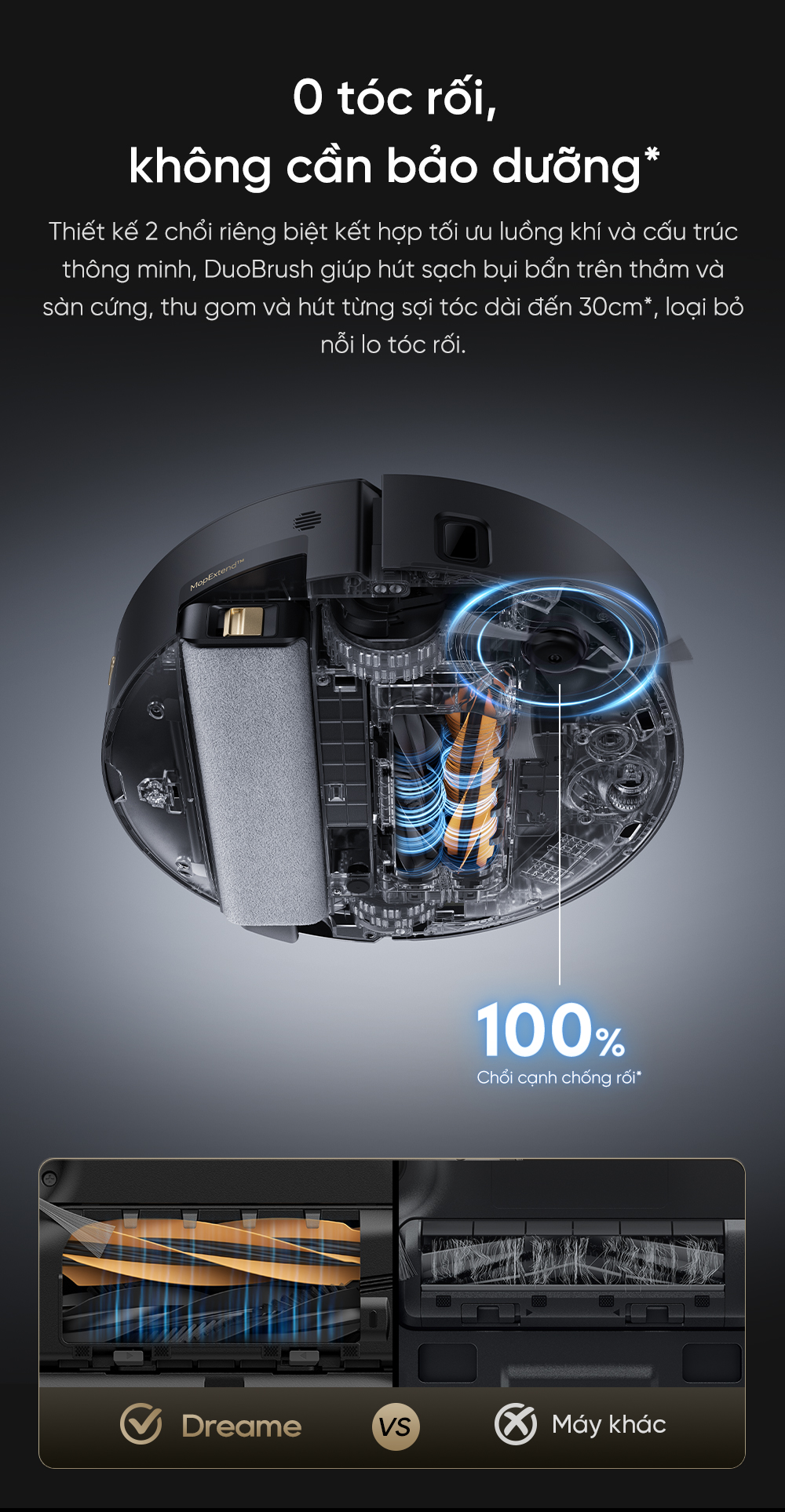 Sản phẩm được trang bị hệ thống Hyperstream™ Detangling Duo Brush, gồm chổi chính kép có khả năng tự gỡ rối tóc, ngăn tình trạng tóc quấn gây tắc nghẽn, đảm bảo hiệu quả hút bụi tối ưu và bền bỉ theo thời gian.