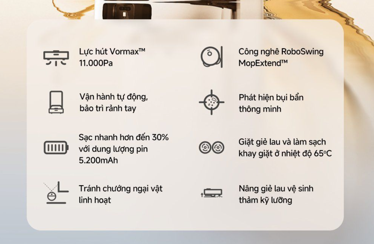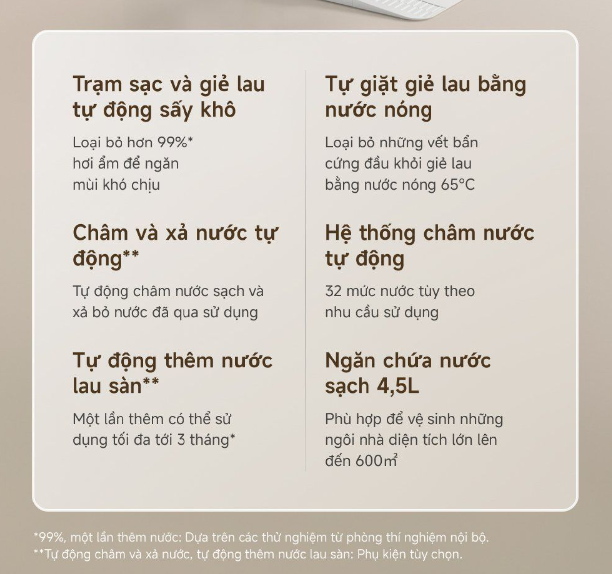 Với thuật toán mạnh mẽ, Dreame L30s Ultra điều hướng mượt mà qua các chướng ngại vật, đảm bảo phủ kín toàn bộ phòng mà không bỏ sót bất kỳ góc nào, ngay cả dưới các đồ nội thất thấp. Đặc biệt, với tuổi thọ dài và khả năng mở rộng miếng đệm lau nhà hơn 1 triệu lần trong các thử nghiệm độ bền, Dreame L30s Ultra chắc chắn là giải pháp dọn dẹp lý tưởng cho mọi gia đình.