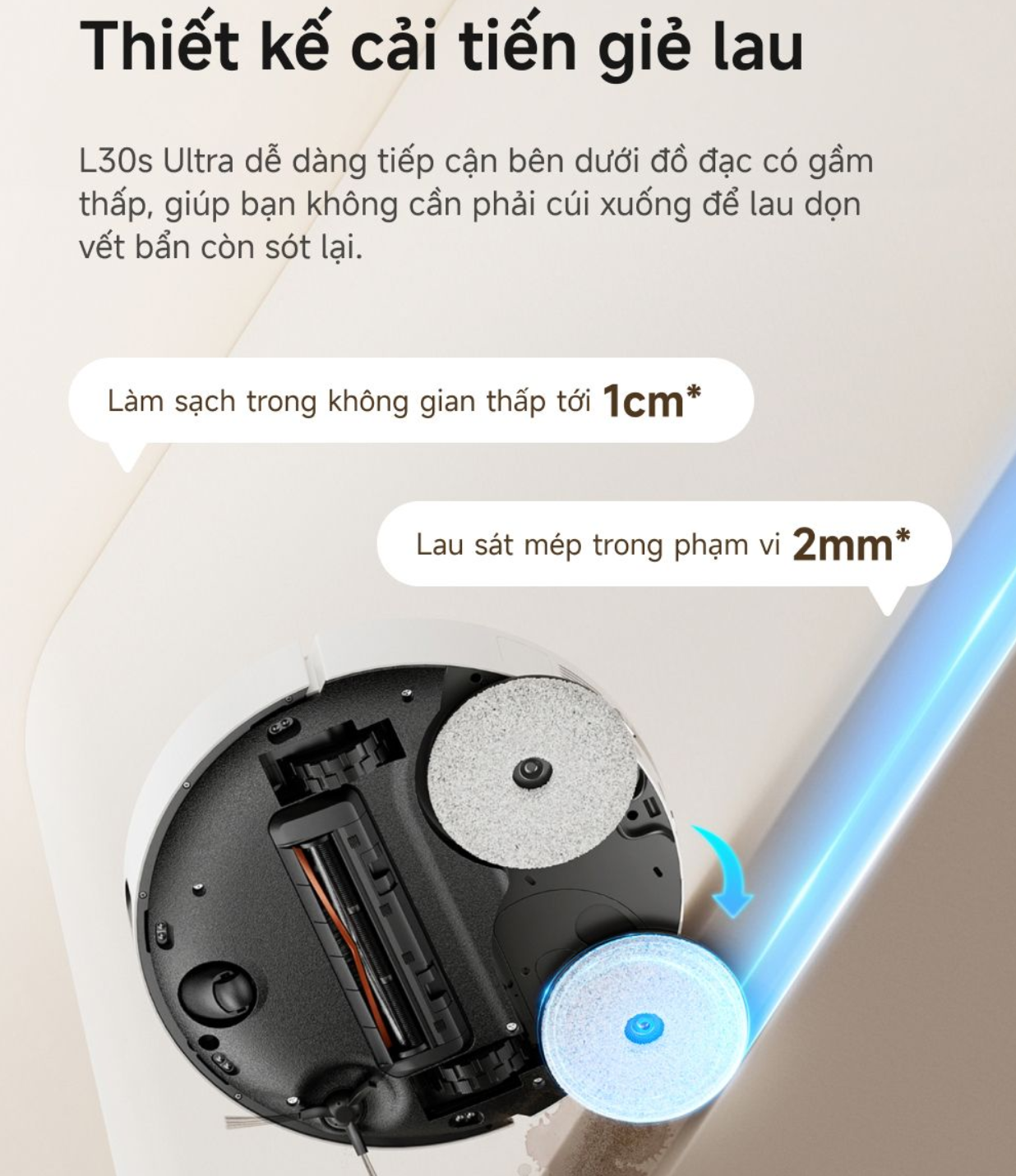 Robot hút bụi lau nhà Dreame L30s Ultra được trang bị thiết kế cây lau nhà tiên tiến, giúp dễ dàng len lỏi dưới các đồ nội thất thấp mà không cần phải cúi người để lau dọn các vết bẩn còn sót lại. Với khả năng làm sạch ở những không gian chỉ cao 1cm, robot hút bụi này còn có thể lau sát các cạnh với khoảng cách chỉ 2mm.