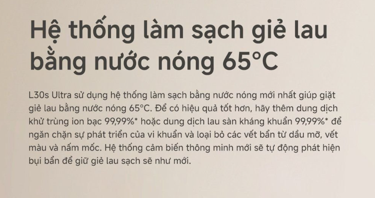 Hệ thống làm sạch bằng nước nóng ở 65°C giúp loại bỏ các vết bẩn cứng đầu trên phần khăn lau, đặc biệt là những vết bẩn dầu mỡ. Đồng thời, với khả năng tự động làm khô khăn lau giúp loại bỏ hơn 99% độ ẩm để loại bỏ mùi hôi khó chịu.