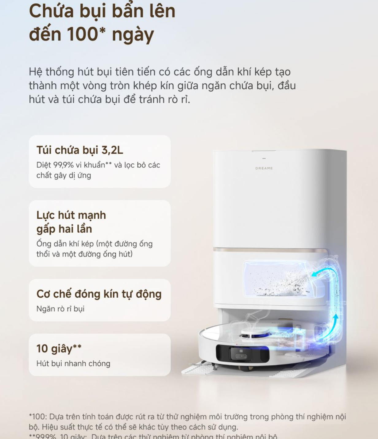 Dreame L30s Ultra sở hữu hệ thống tự động thu gom bụi kín tiên tiến, có khả năng lưu trữ bụi lên đến 100 ngày. Hệ thống này sử dụng hai ống dẫn khí tạo thành vòng tuần hoàn khép kín giữa hộp bụi, miệng hút và túi đựng bụi, ngăn ngừa rò rỉ. Túi thu gom bụi dung tích 3.2L có thể tiêu diệt 99.9% vi khuẩn và lọc các chất gây dị ứng, đảm bảo không khí trong nhà luôn trong lành. Hệ thống hút kép với hai ống dẫn khí – một ống thổi và một ống hút, giúp thu gom bụi nhanh chóng chỉ trong 10 giây.