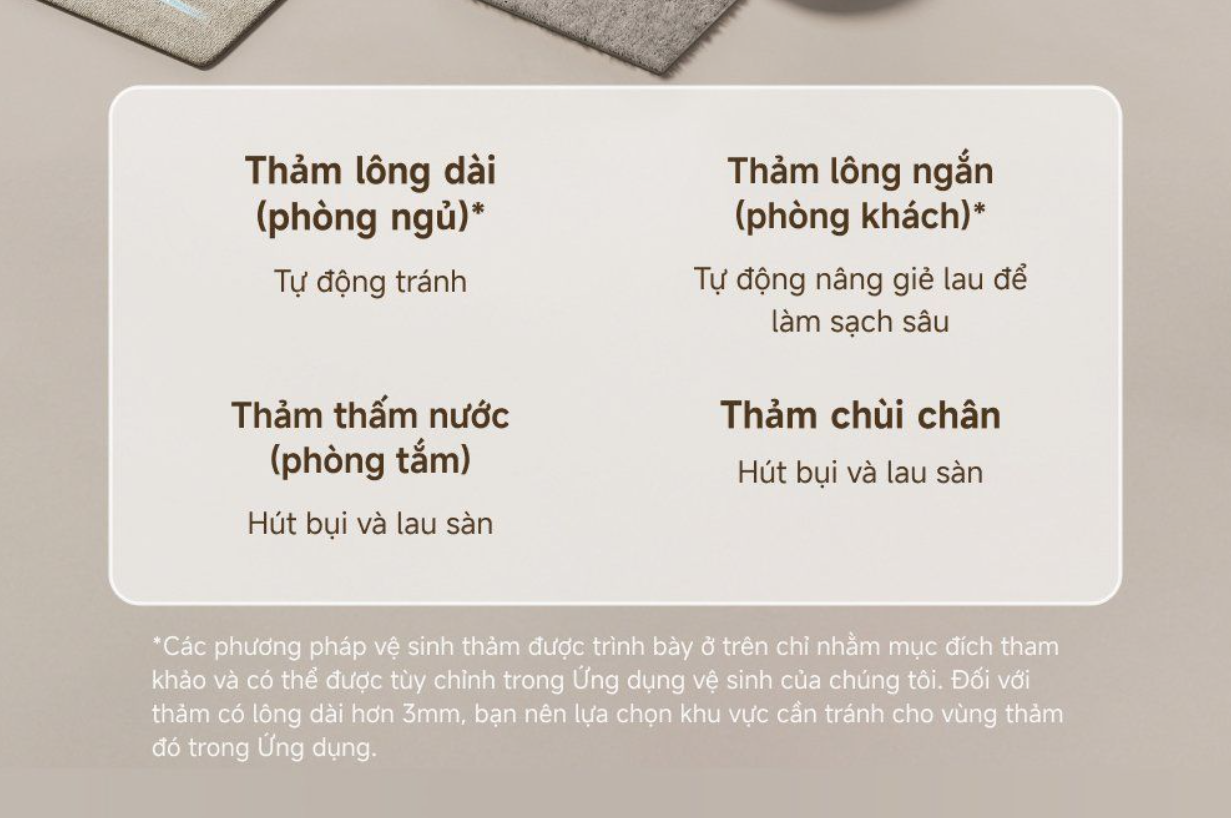 Dreame L30s Ultra mang đến khả năng làm sạch thảm thông minh, nhận diện các loại thảm khác nhau và tự động thay đổi chiến lược làm sạch dựa trên các loại thảm. Đối với các loại thảm lông dài (như trong phòng ngủ), robot tự động tránh làm sạch để bảo vệ thảm. Đối với thảm lông ngắn (như trong phòng khách), robot tự động nâng miếng đệm lau để thực hiện làm sạch chuyên sâu. Với các tính năng này, Dreame L30s Ultra giúp tối ưu hóa quá trình làm sạch cho từng loại bề mặt, đảm bảo mọi khu vực trong nhà đều được chăm sóc tận tình.