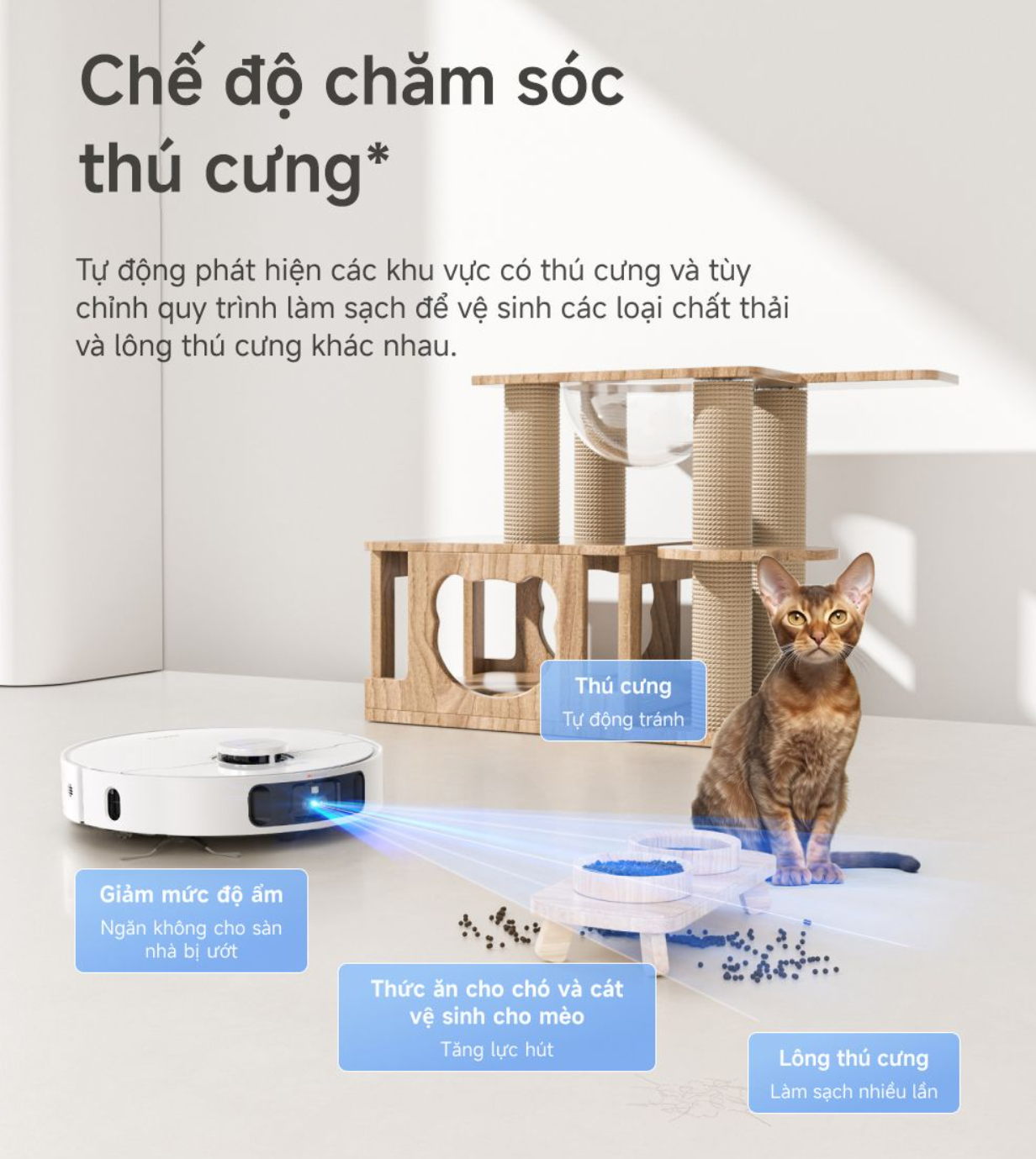Robot Dreame L30s Ultra được trang bị chế độ chăm sóc thú cưng đặc biệt, tự động phát hiện các khu vực có thú cưng và điều chỉnh chiến lược làm sạch để xử lý các loại rác thải và lông thú khác nhau. Chế độ này giúp giảm độ ẩm, ngăn ngừa sàn nhà bị ướt, bảo vệ mặt sàn nhà của bạn.