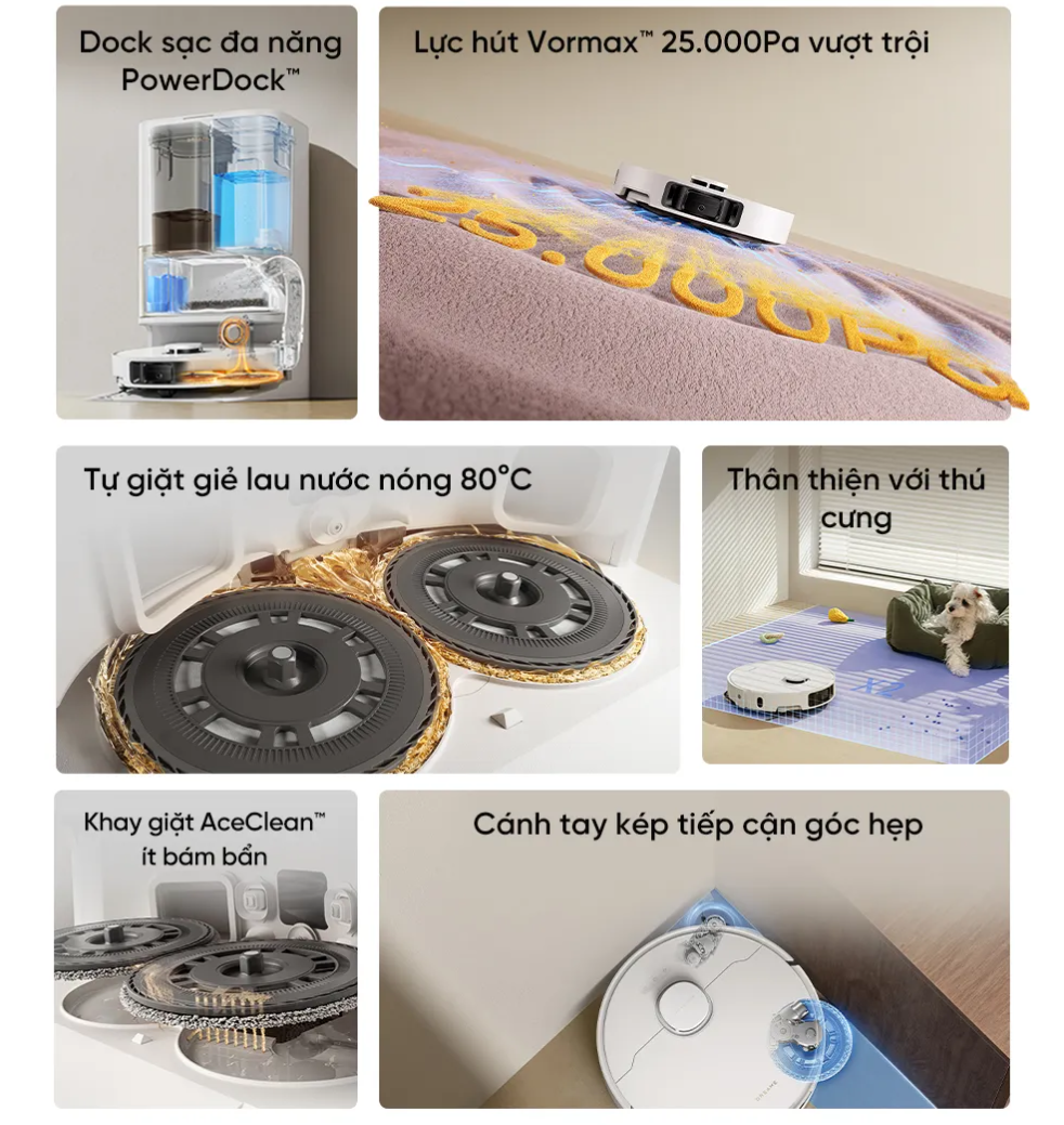 Không chỉ là nơi để sạc pin, PowerDock™ còn là trạm vệ sinh thông minh giúp robot luôn trong trạng thái sẵn sàng làm sạch. Hệ thống 20 vòi phun mạnh mẽ cùng công nghệ AceClean™ DryBoard giúp chà sạch và rửa giẻ lau bằng nước nóng 80°C, loại bỏ tới 99% vết bẩn và vi khuẩn. Trạm sạc còn có thể tự động sấy khô giẻ lau bằng khí nóng, đồng thời đổ rác và nạp nước hoàn toàn tự động.