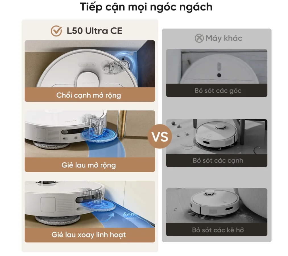 Ứng dụng công nghệ SideReach™ và MopExtend™ RoboSwing, robot hút bụi lau nhà Dreame L50 Ultra CE có khả năng vươn rộng tấm lau và đầu hút để tiếp cận mọi ngóc ngách, từ chân bàn cong, gầm tủ thấp đến kẽ hẹp sát tường. Robot có thể lau sát chỉ còn vài mm kẽ hở, đảm bảo làm sạch tới 99% bề mặt góc cạnh, nơi mà hầu hết các robot khác thường bỏ sót. Đây chính là ưu thế vượt trội giúp Dreame L50 Ultra CE trở thành chuyên gia diệt bụi thực thụ trong mọi không gian.
