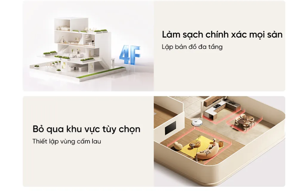 Với hệ thống định hướng Pathfinder™, robot có thể quét toàn bộ không gian 360°, tạo bản đồ chi tiết và tối ưu tuyến đường di chuyển cho từng khu vực. Dreame L50 Ultra CE hỗ trợ lập bản đồ đa tầng, dễ dàng nhận diện từng mặt sàn riêng biệt trong ngôi nhà. Người dùng có thể thiết lập vùng cấm lau, chọn khu vực dọn dẹp theo yêu cầu, hoặc lưu lại thói quen làm sạch cá nhân hóa, giúp robot hoạt động chính xác theo nhu cầu của từng gia đình.