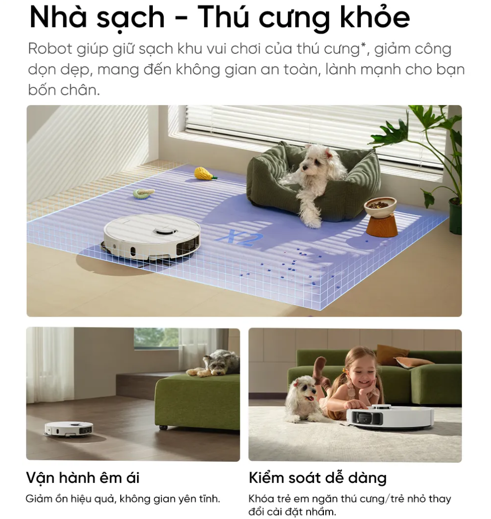 - Tích hợp chế độ làm sạch thân thiện với thú cưng