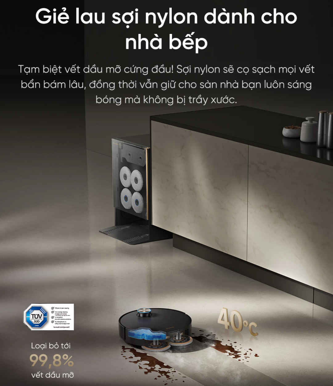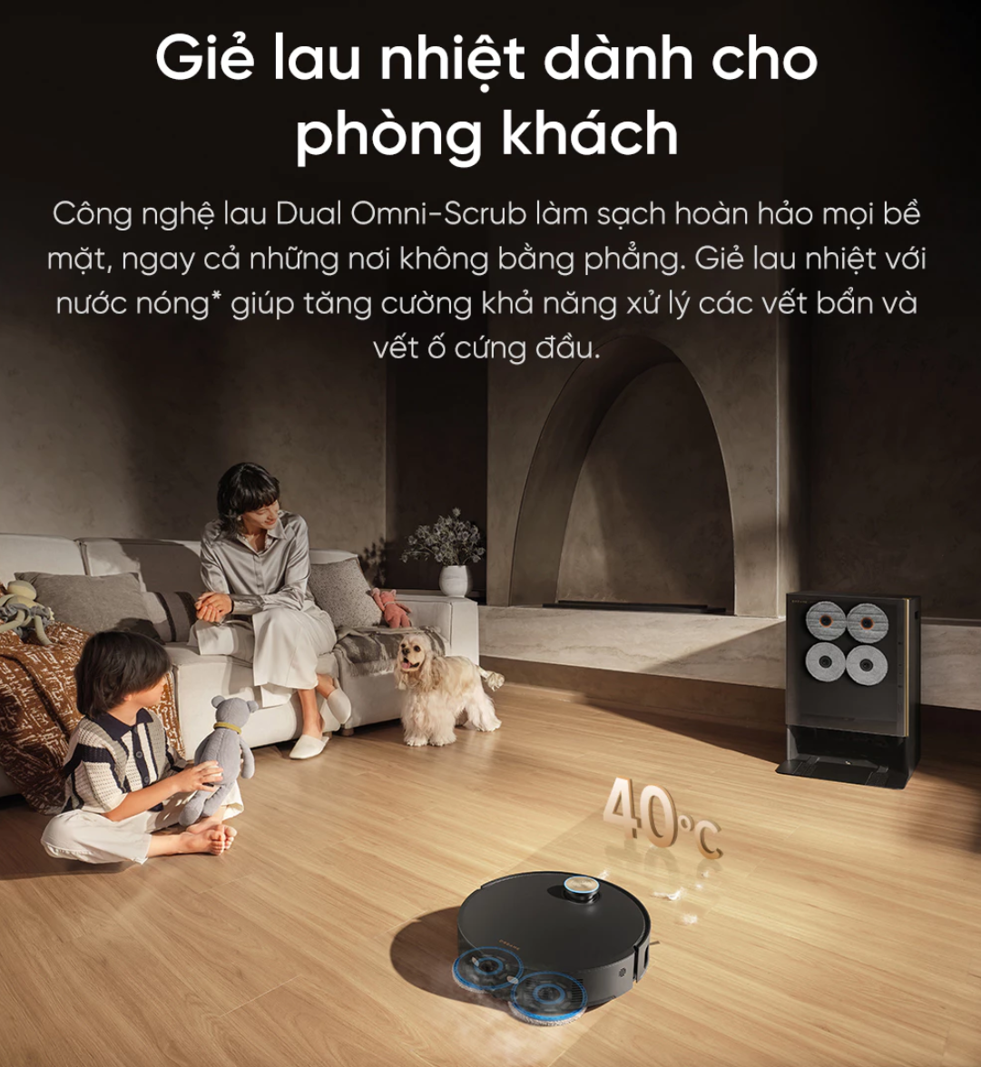 Phòng khách: Giẻ lau nhiệt + công nghệ Dual Omni-Scrub giúp loại bỏ vết bẩn cứng đầu.