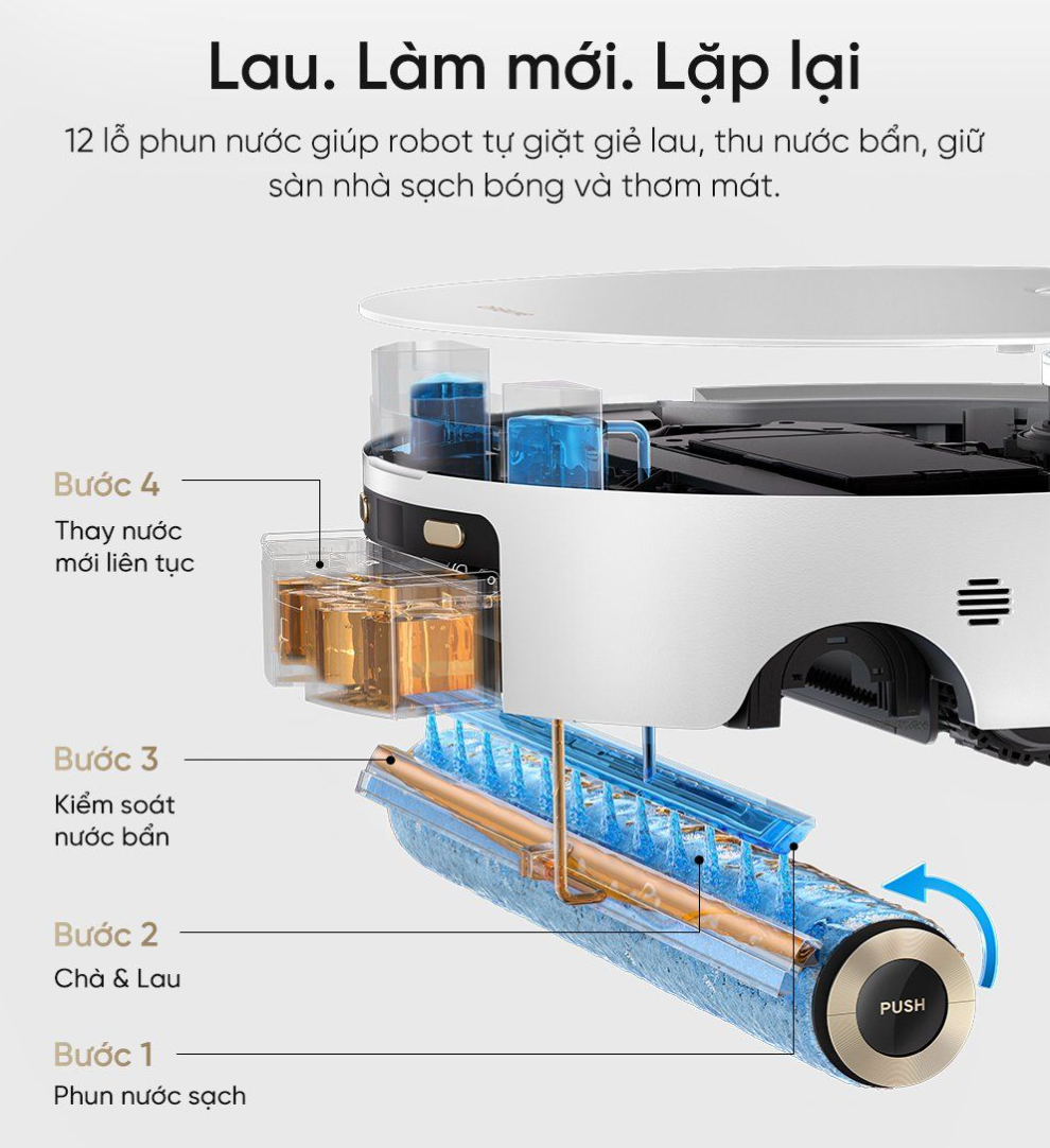 Giẻ lau được làm ẩm và tự làm sạch ngay trong quá trình hoạt động, kết hợp lực nén đa chiều, giúp chà sạch mọi vết bẩn cứng đầu như cà phê, dầu mỡ hay nước tương khô.