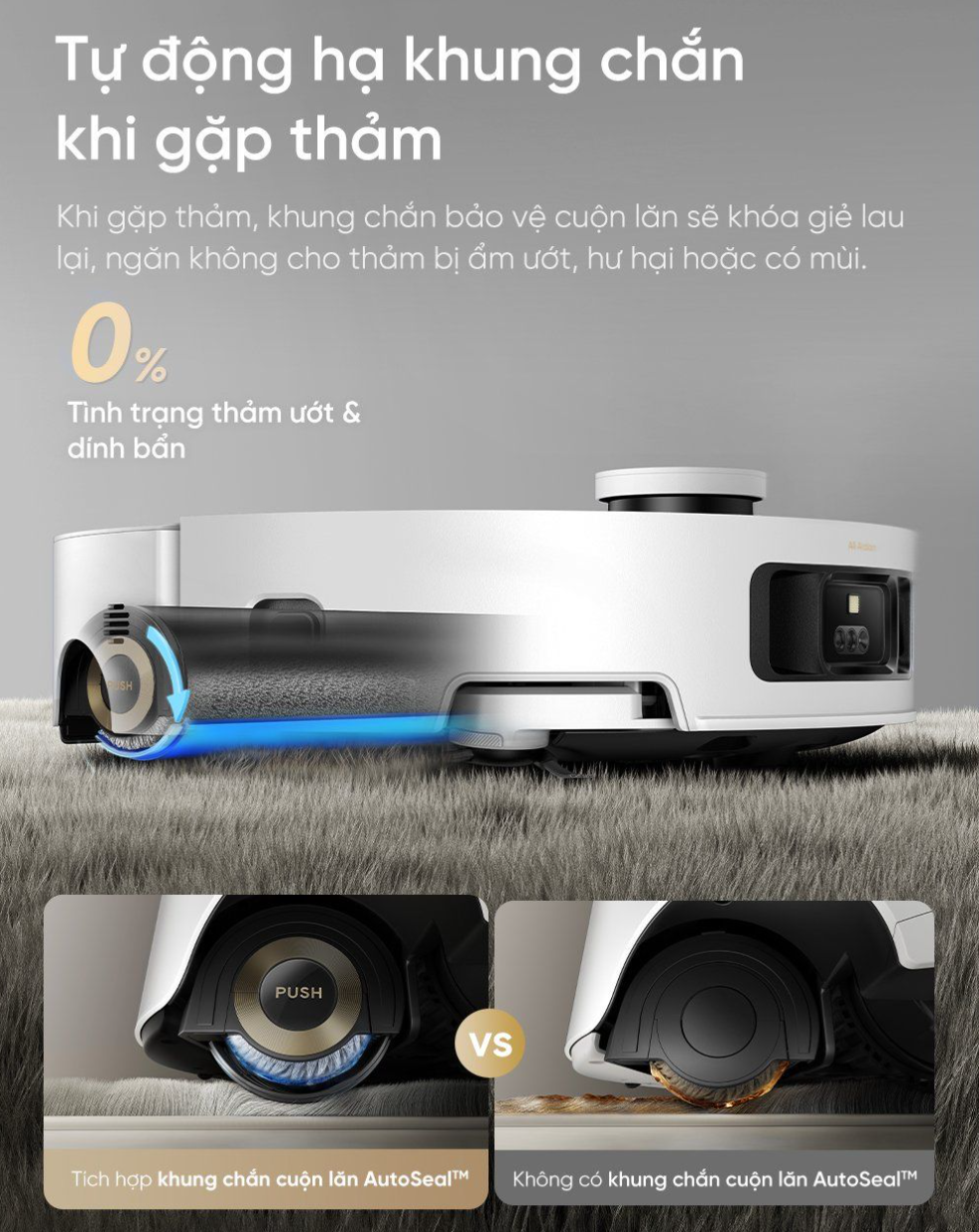 Robot được trang bị khung chắn cuộn lăn AutoSeal™, giúp khóa giẻ lau lại ngay khi phát hiện thảm.