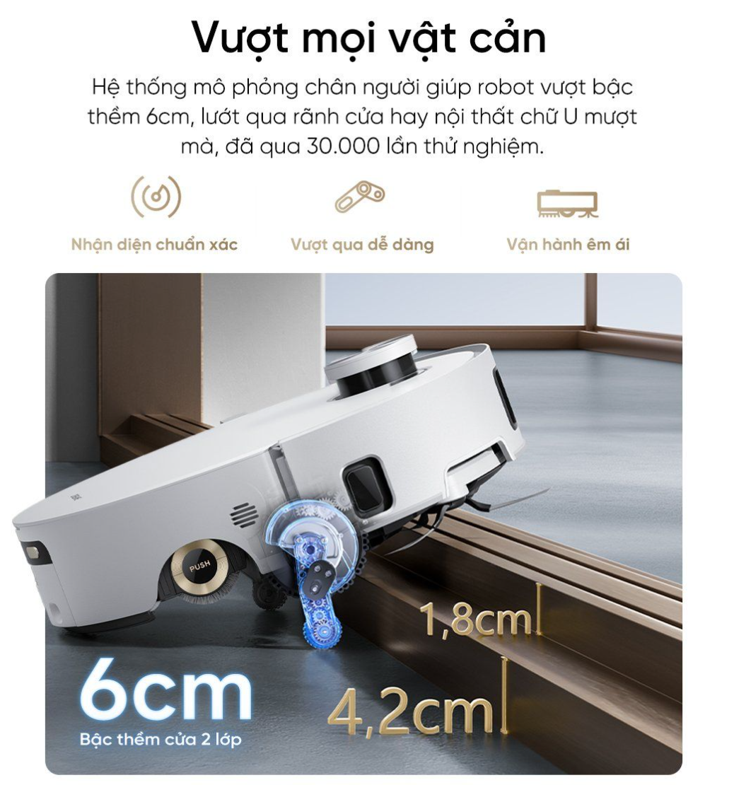 Nhờ hệ thống mô phỏng bước chân người, Dreame Aqua10 Roller vượt bậc thềm cao đến 6cm, lướt mượt qua rãnh cửa, thảm dày hay nội thất chữ U.