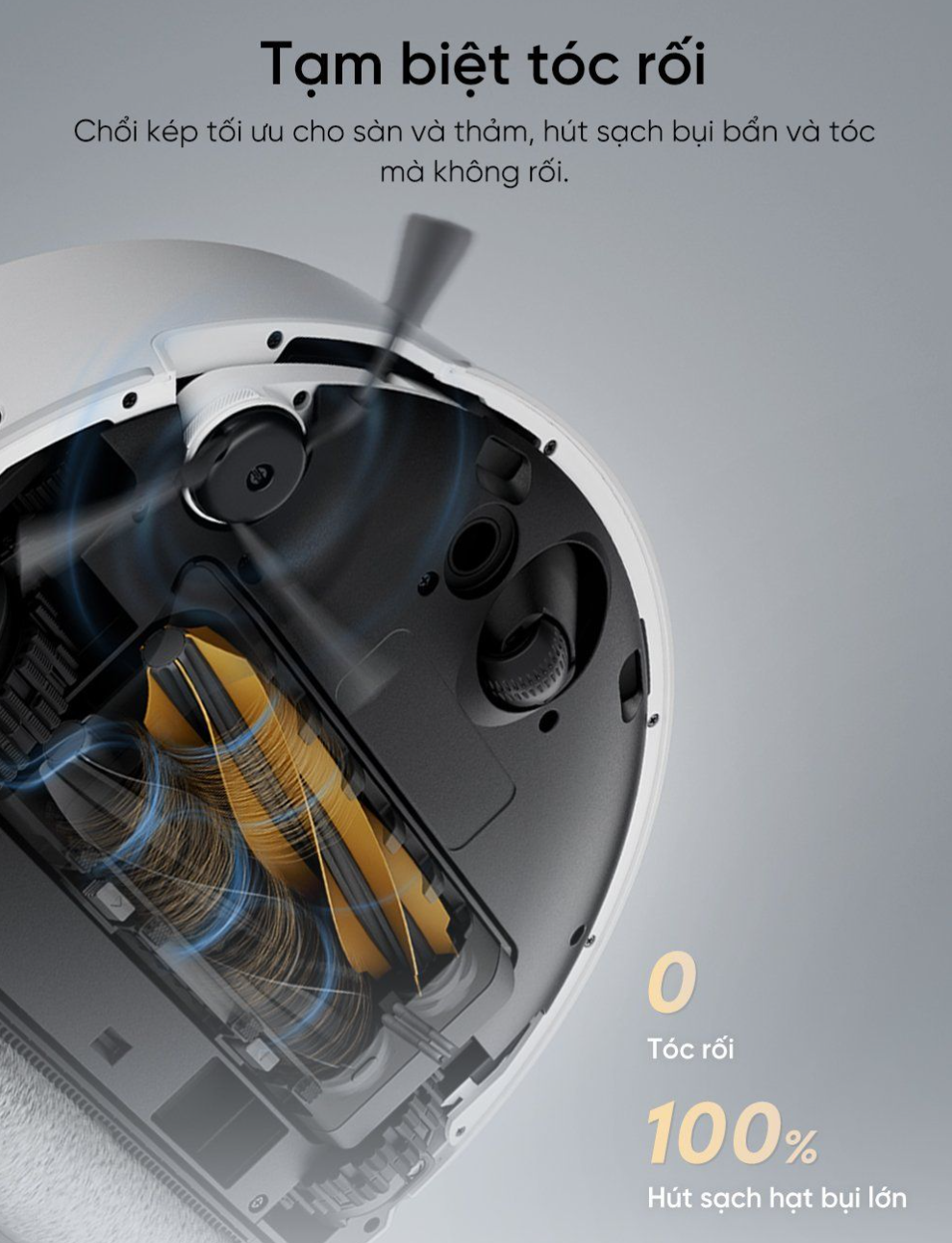 Cấu trúc chống rối giúp robot tự cắt và gỡ tóc, giữ cho cuộn chổi luôn sạch sẽ, đảm bảo hiệu suất hút ổn định lâu dài.