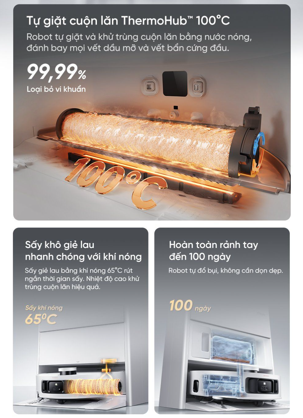 Sau khi giặt, robot sẽ sấy khô bằng khí nóng 65°C, rút ngắn thời gian sấy và ngăn mùi ẩm mốc tuyệt đối.