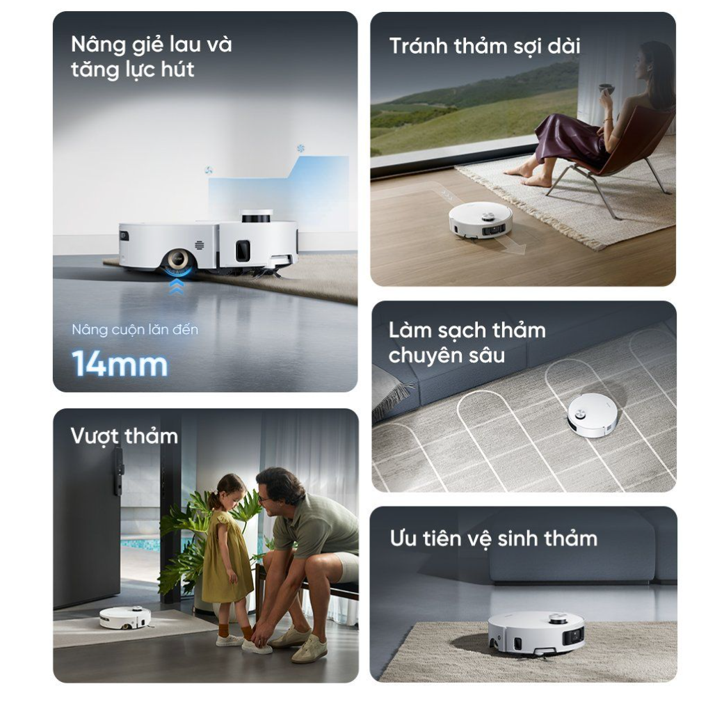 Khi phát hiện thảm, robot tự động nâng cuộn lăn lên 14mm, đồng thời tăng lực hút để làm sạch thảm sâu hơn mà không làm ướt.