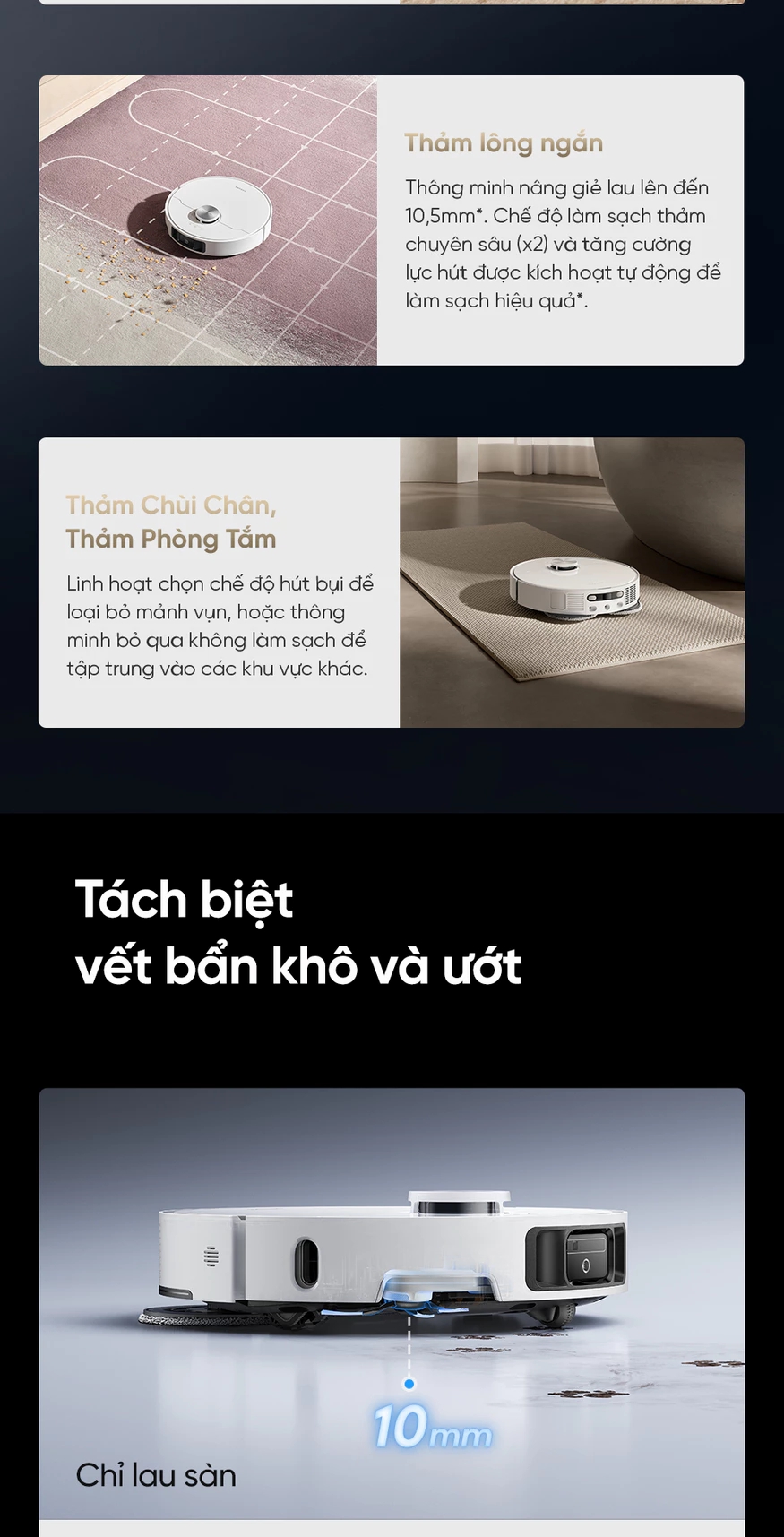 Với công nghệ tay kép, robot có thể mở rộng chổi cạnh đến 4cm, làm sạch sát tường, chân nội thất, và các khu vực hẹp. Khi phát hiện thảm, Dreame L40s Ultra tự động nâng giẻ lau lên 10,5mm để tránh làm ướt thảm, đồng thời hạ thấp chổi cạnh nhằm tối ưu khả năng làm sạch.