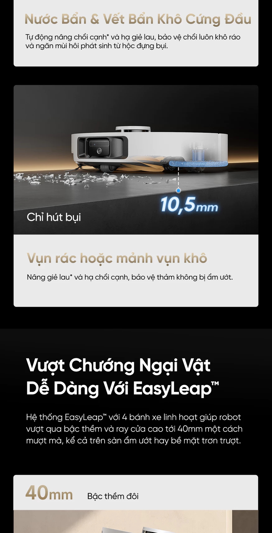 Dreame L40s Ultra được trang bị hệ thống EasyLeap™ với 4 bánh xe linh hoạt, giúp robot dễ dàng vượt qua các bậc thềm và ray cửa cao tới 40mm. Bạn có thể yên tâm để robot tự động di chuyển khắp nhà mà không bị kẹt lại.