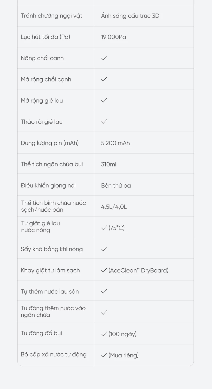 Khay giặt AceClean™ với 20 vòi phun nước nóng và bàn giặt tốc độ cao giúp robot tự động giặt sạch giẻ lau sau mỗi lần sử dụng, loại bỏ cặn bẩn hiệu quả. Điều này kéo dài tuổi thọ giẻ lau và giữ cho robot luôn sạch sẽ, hạn chế vi khuẩn sinh sôi.