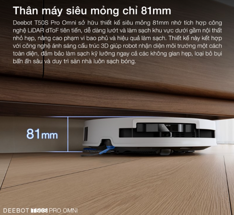 Thiết kế siêu mỏng chỉ 81mm cùng công nghệ LiDAR dToF ẩn giúp robot hút bụi lau nhà Deebot T50S Pro Omni len lỏi sâu vào các khu vực gầm bàn, gầm giường,... để làm sạch triệt để. Được trang bị bộ đôi công nghệ ánh sáng 3D và camera RGB tích hợp AI, robot có khả năng quan sát và phân tích môi trường nhạy bén.