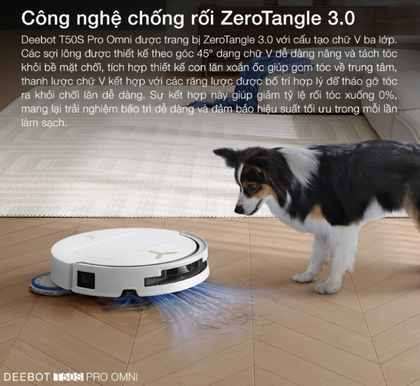Nhờ ZeroTangle 3.0 với thiết kế chổi chính cấu tạo chữ V ba lớp độc đáo, robot Ecovacs Deebot T50S Pro Omni mang đến khả năng xử lý tóc quấn rối cực kỳ hiệu quả. Các sợi lông chổi được đặt nghiêng một góc 45°, tạo ra lực đẩy cơ học giúp tách rời lông thú cưng và tóc dài khỏi mặt sàn ngay lập tức, ngăn chặn tình trạng bám dính từ sớm.