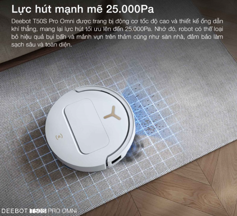 Nhờ sự cộng hưởng giữa động cơ tốc độ cao và cấu trúc ống dẫn khí thẳng tiên tiến, robot hút bụi lau nhà Deebot T50S Pro Omni xác lập hiệu suất làm sạch đột phá. Thiết kế luồng gió tối ưu giúp hạn chế tối đa tình trạng thất thoát năng lượng, tạo ra sức mạnh hút cực đại lên đến 25.000Pa.