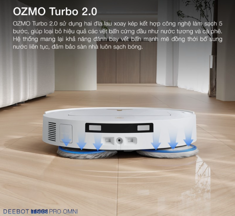 Robot hút bụi lau nhà Deebot T50S Pro Omni sở hữu khả năng dọn dẹp vượt trội nhờ hệ thống lau xoay OZMO Turbo 2.0. Sự phối hợp giữa hai đĩa lau xoay kép áp lực cao cùng quy trình 5 bước khép kín giúp thiết bị dễ dàng tiếp cận, đánh bay các mảng bám cứng đầu. Những vết bẩn khô lâu ngày như nước tương, cà phê hay dấu chân thú cưng đều được xử lý gọn gàng và hiệu quả.