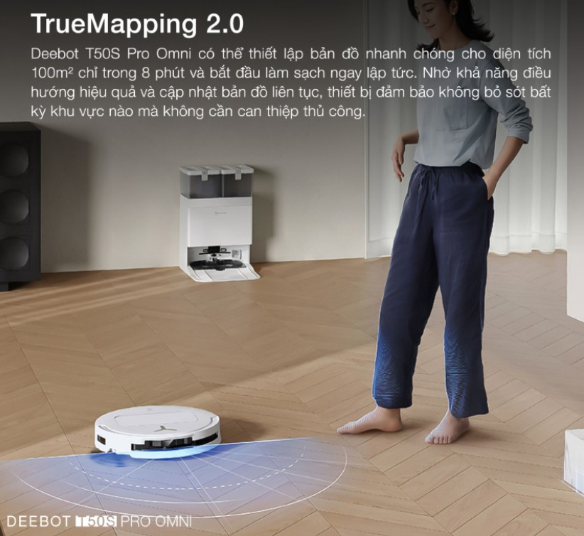 Cơ chế điều hướng linh hoạt cho phép máy cập nhật dữ liệu mặt sàn theo thời gian thực. Đặc điểm ưu việt giúp Deebot T50S Pro Omni tự động điều chỉnh hành trình di chuyển mỗi khi có sự thay đổi về vị trí đồ đạc trong nhà. Nhờ sự chủ động trong việc bao phủ mọi ngóc ngách, hiệu suất làm sạch luôn được duy trì ở mức cao nhất mà không cần đến bất kỳ sự can thiệp thủ công nào từ phía gia chủ.