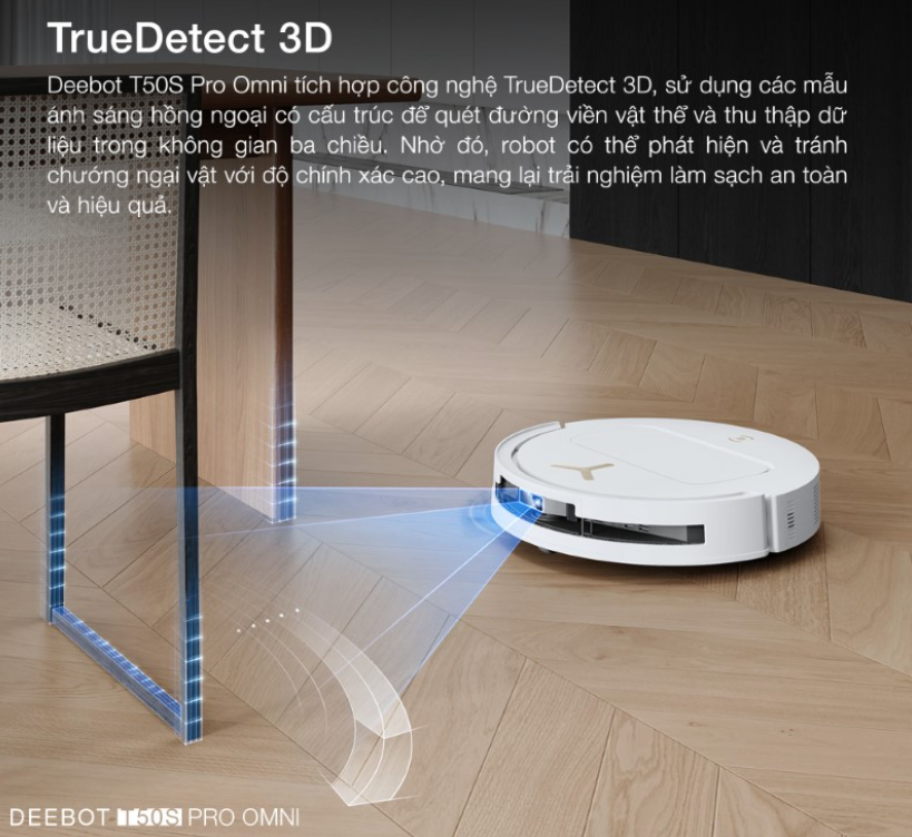 Công nghệ TrueDetect 3D sử dụng các mẫu ánh sáng hồng ngoại có cấu trúc để quét chi tiết đường viền vật thể, giúp tái hiện không gian ba chiều xung quanh robot. Nhờ dữ liệu hình khối trực quan, robot hút bụi lau nhà Ecovacs Deebot T50S Pro Omni có thể nhận diện chính xác những vật cản nhỏ nhất như dây điện, đồ chơi trẻ em hay các loại nội thất thấp.