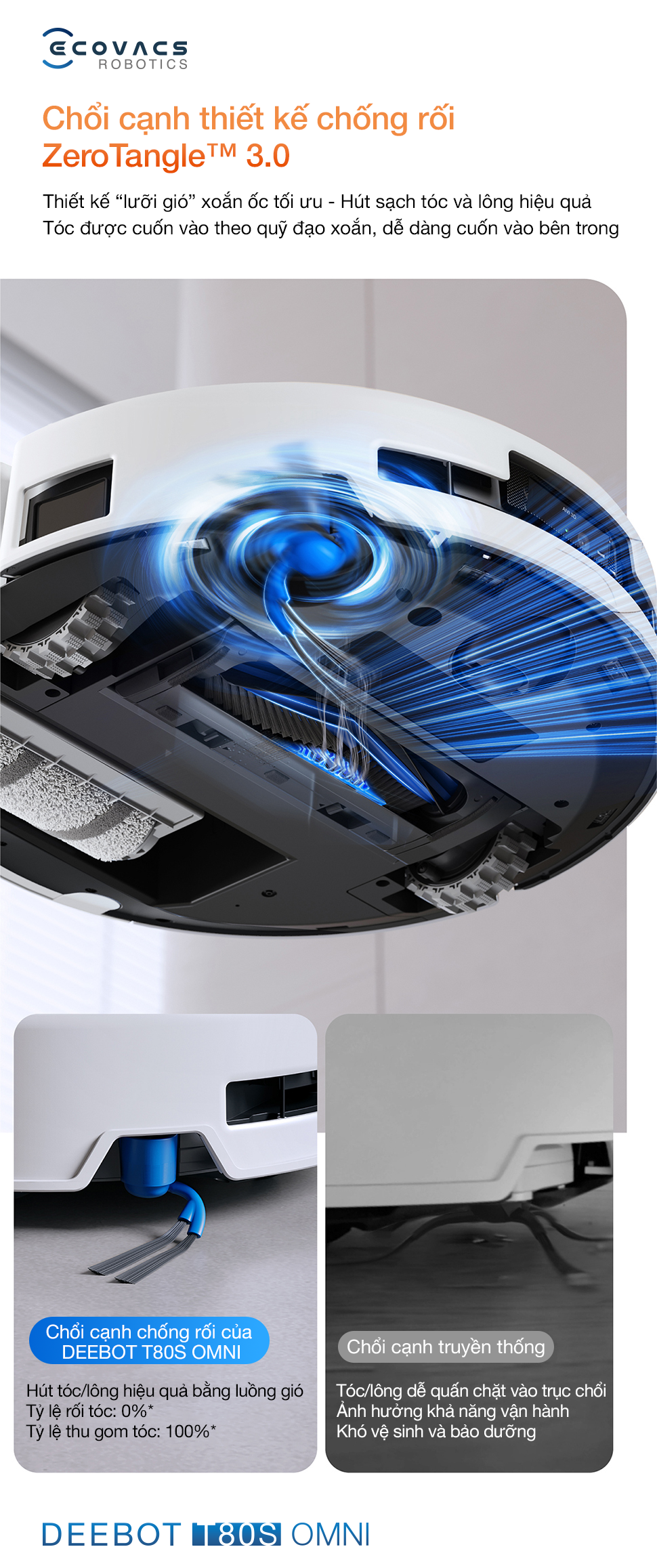 Robot hút bụi lau nhà Ecovacs Deebot T80S Omni được trang bị chổi lăn chống rối ZeroTangle cấu trúc 3V: