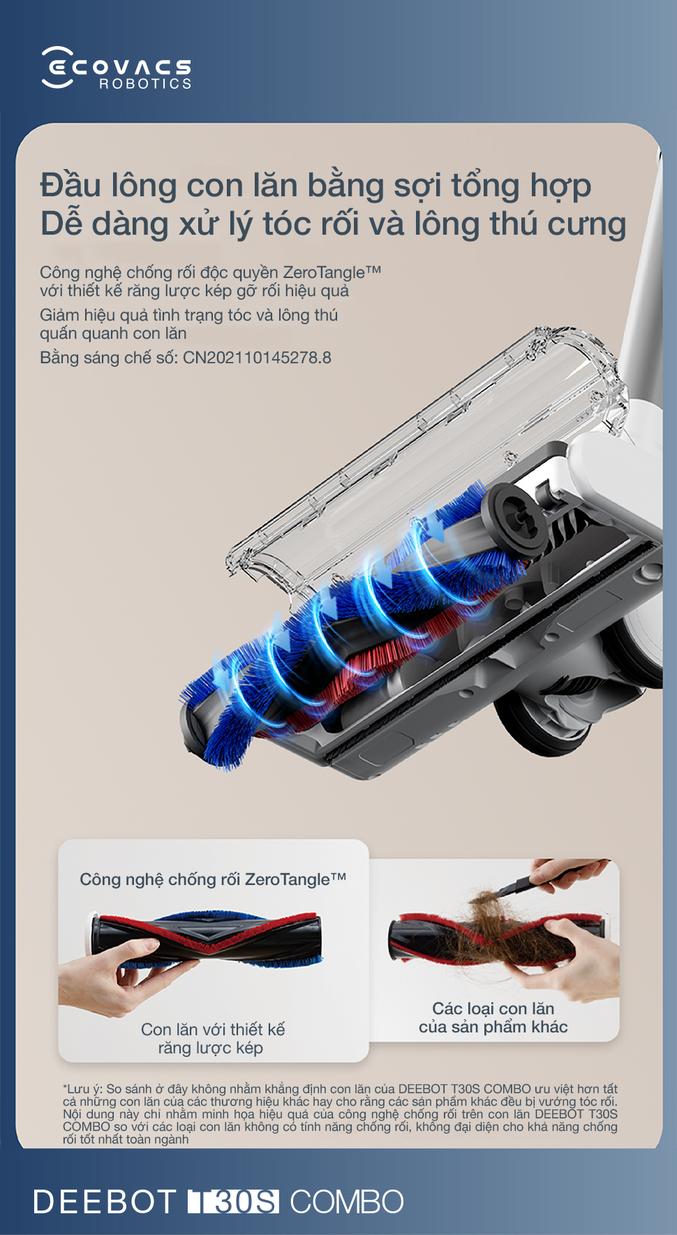 Robot hút bụi lau nhà và máy hút bụi cầm tay Ecovacs Deebot T30S Combo sở hữu công nghệ ZeroTangle™, ngăn ngừa tình trạng chổi chính bị bám dính tóc rối.