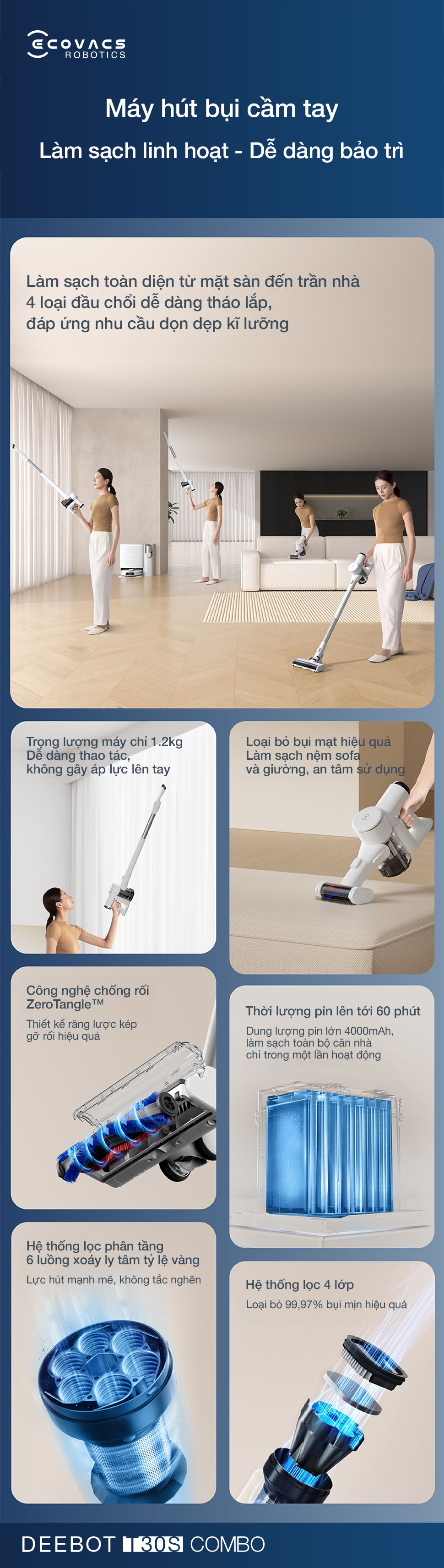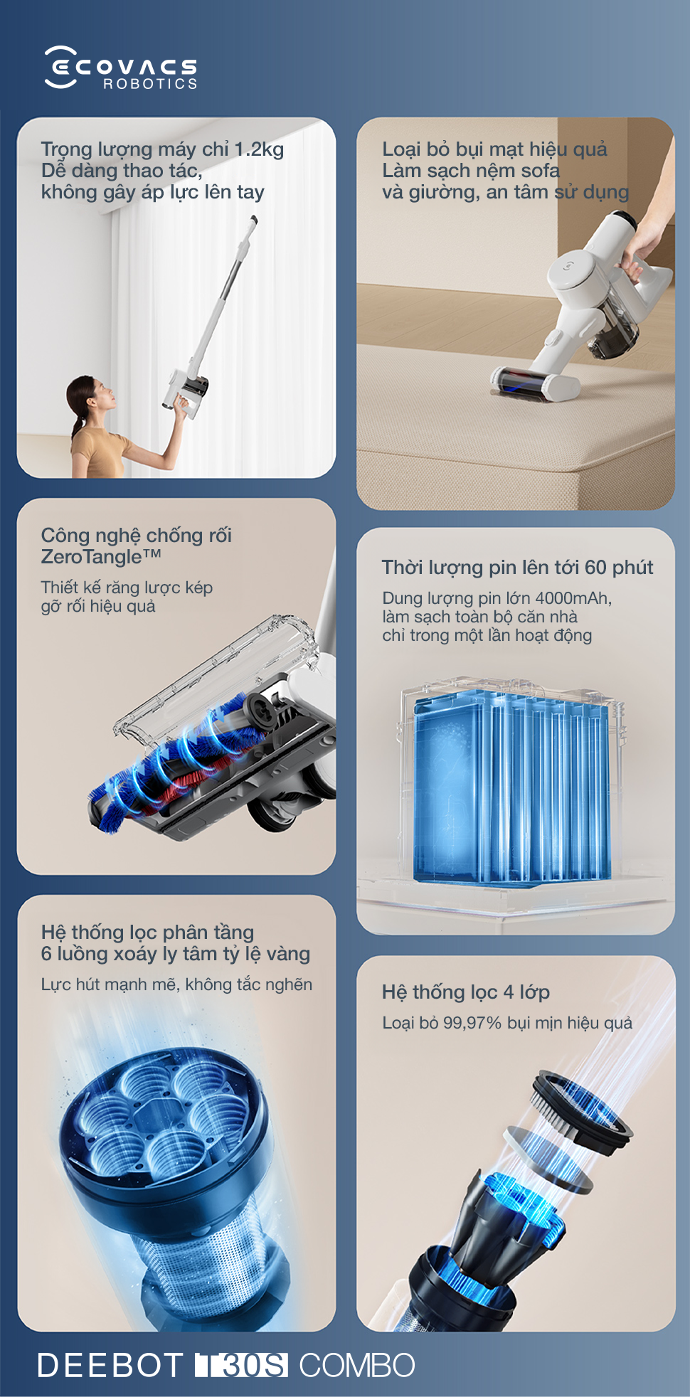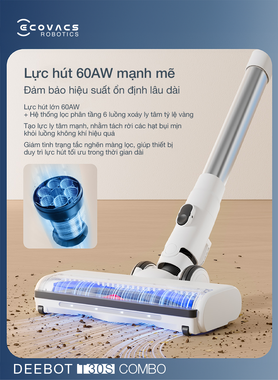 Ecovacs Deebot T30S Combo mang đến trải nghiệm làm sạch toàn diện và hiệu quả với hệ thống lọc bốn giai đoạn tiên tiến, bộ COMBO cọ đa năng, thiết kế gọn nhẹ và khả năng hút tự động tăng cường thông minh.