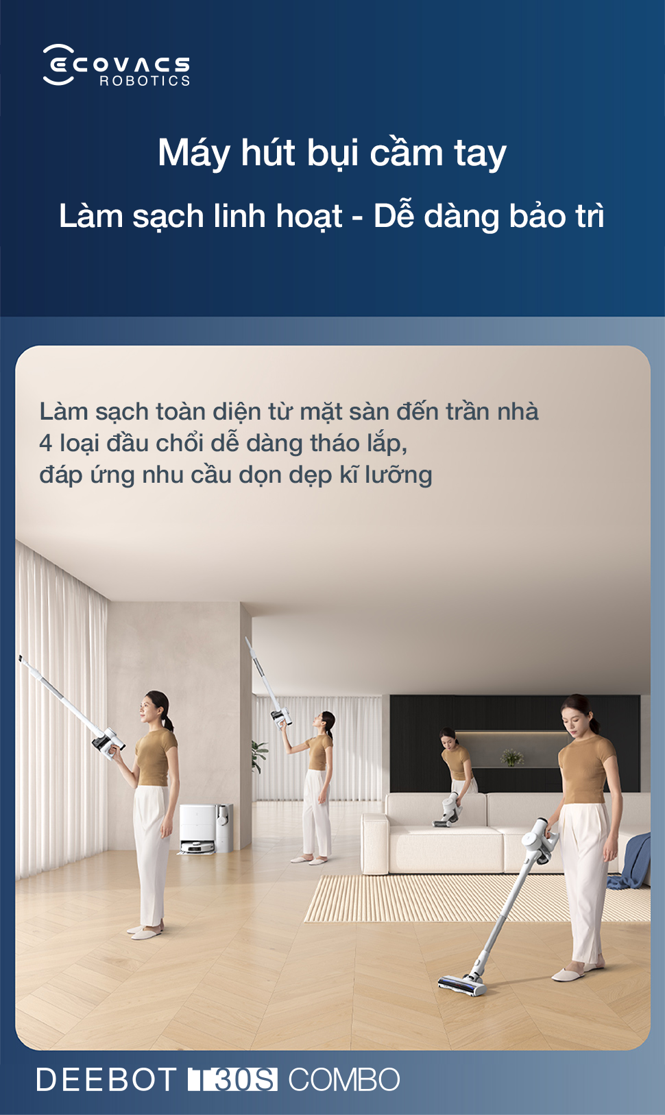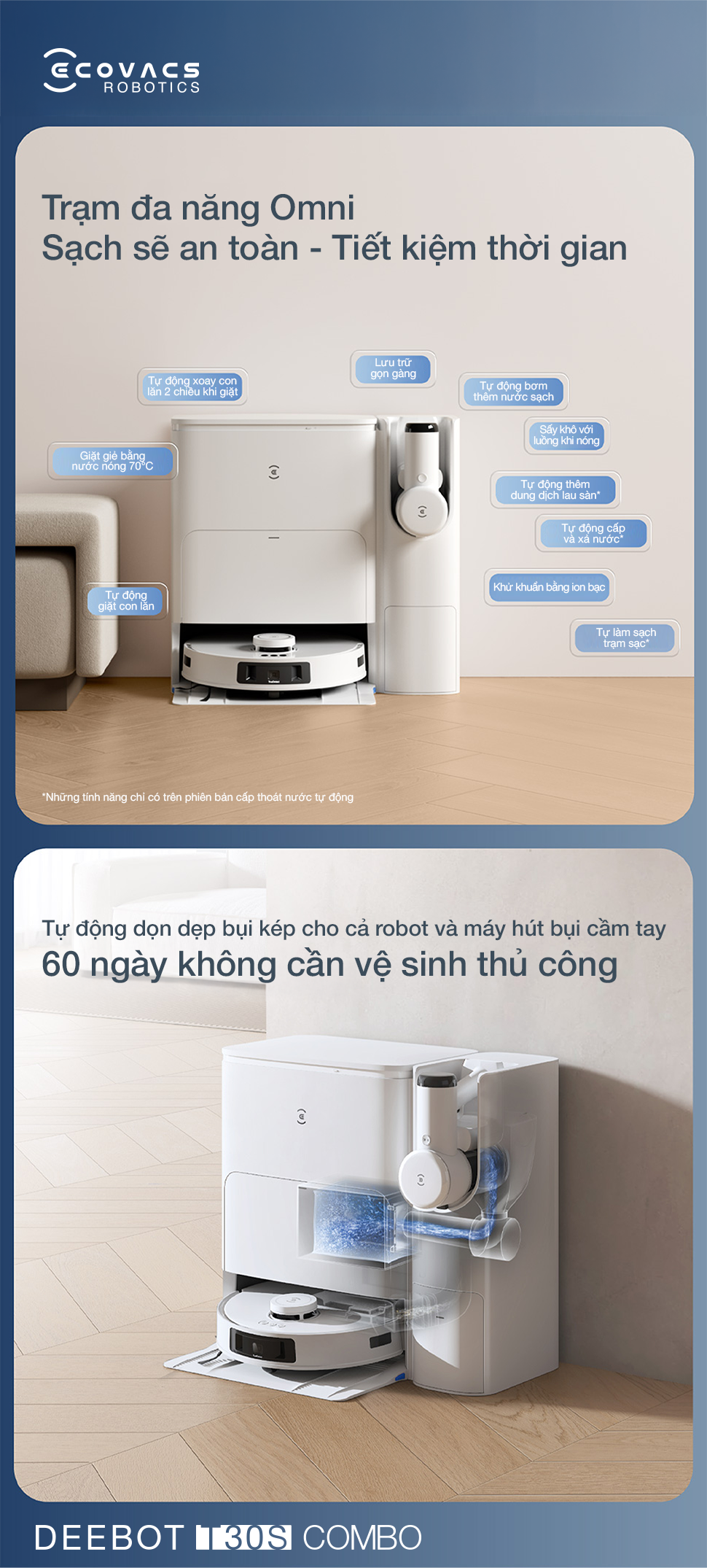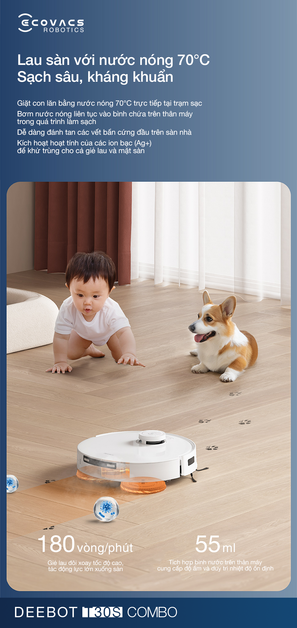Ecovacs Deebot T30S Combo mang đến trải nghiệm làm sạch toàn diện và hiệu quả với hệ thống lọc bốn giai đoạn tiên tiến, bộ COMBO cọ đa năng, thiết kế gọn nhẹ và khả năng hút tự động tăng cường thông minh.