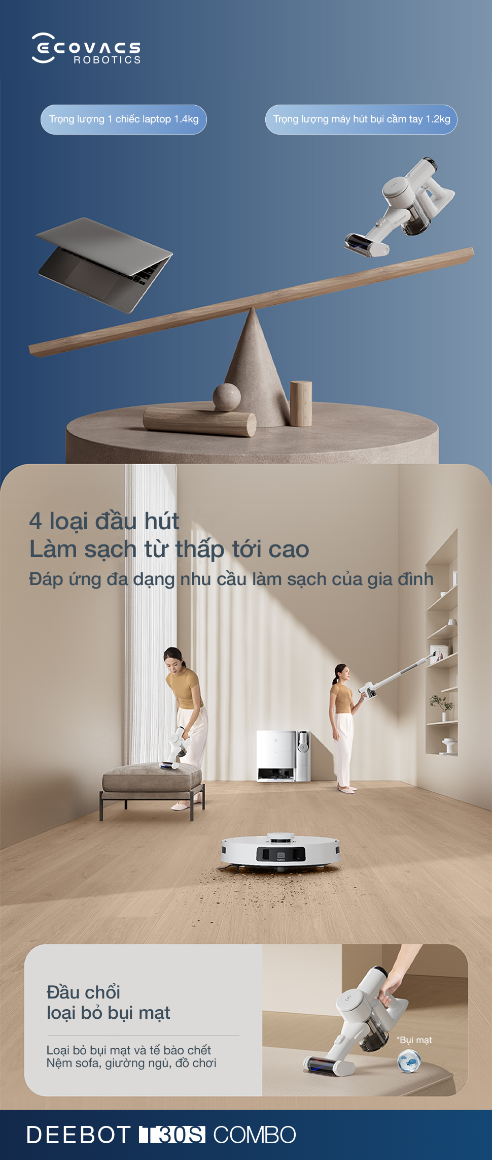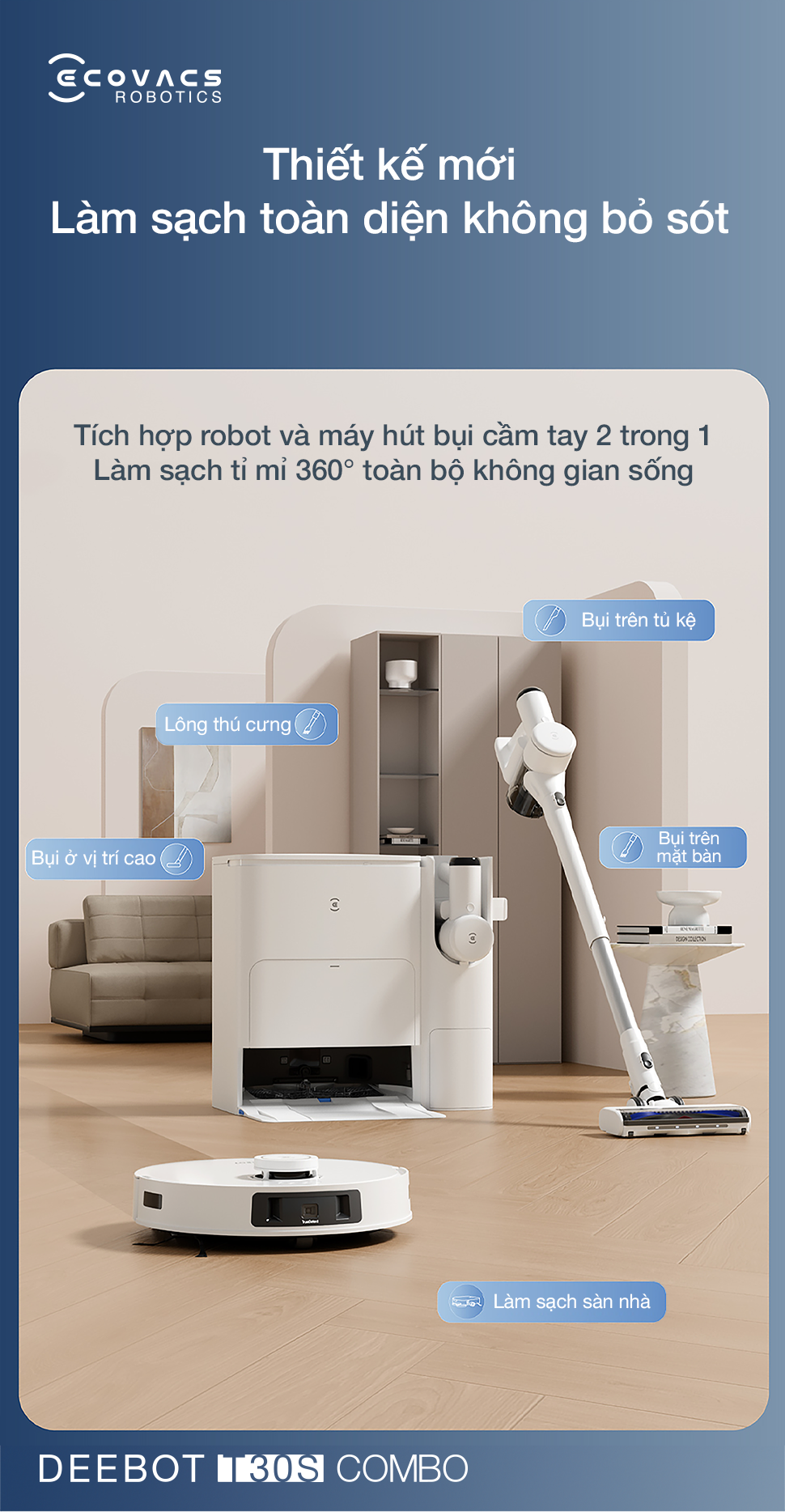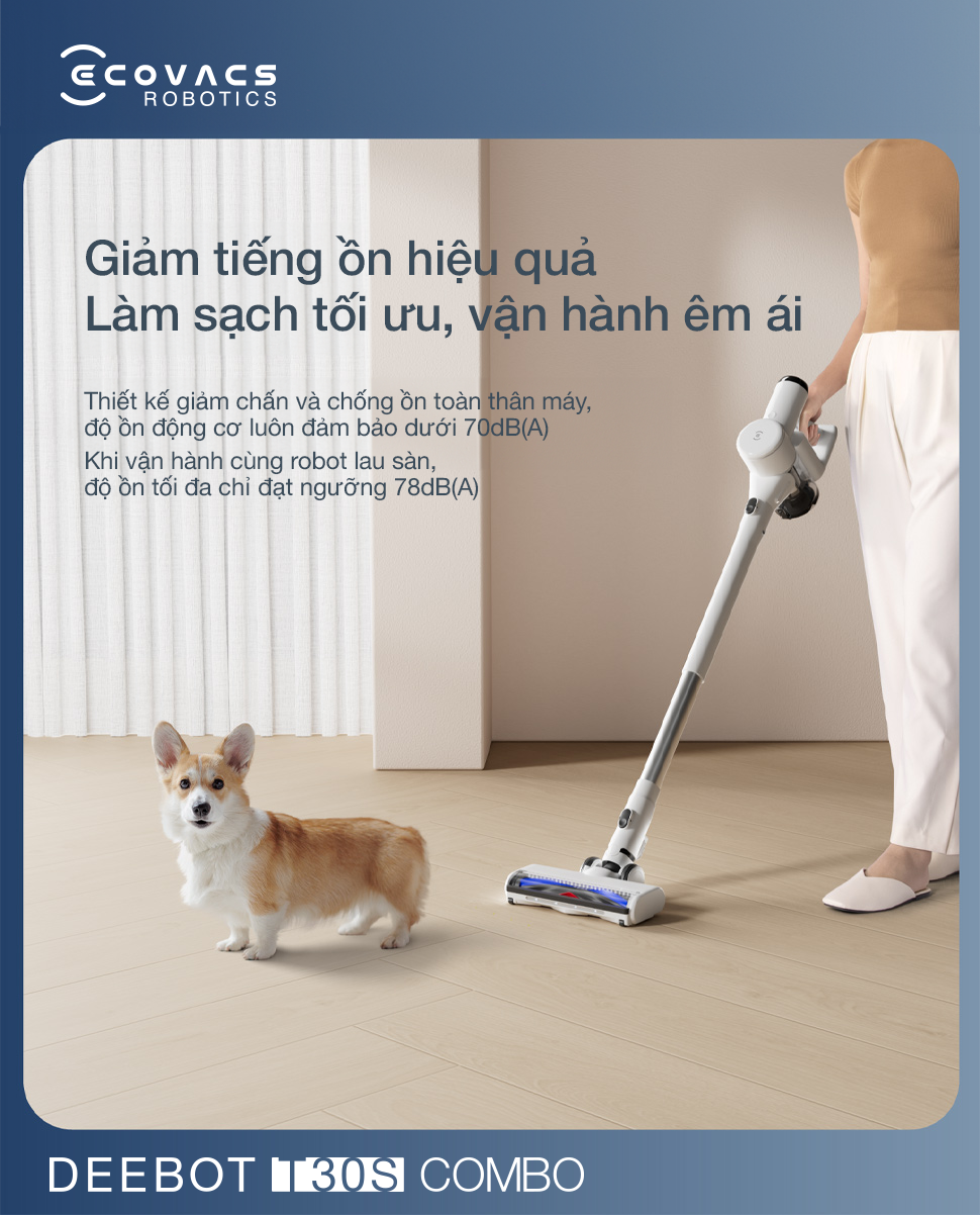 Deebot T30S Combo định nghĩa lại hiệu quả dọn dẹp bằng thiết kế kết hợp sáng tạo, tích hợp robot hút bụi thông minh và máy hút bụi cầm tay đa năng trên cùng một trạm OMNI hai chiều. Sự giao thoa này cho phép robot đảm nhận vai trò làm sạch sàn nhà hoàn toàn tự động, trong khi máy hút bụi cầm tay xử lý tỉ mỉ mọi bụi bẩn tại các góc hẹp hoặc bề mặt cao. Đây chính là bộ giải pháp toàn diện, đáp ứng mọi nhu cầu chăm sóc nhà cửa, mang lại không gian sống sạch sẽ, tinh tươm.