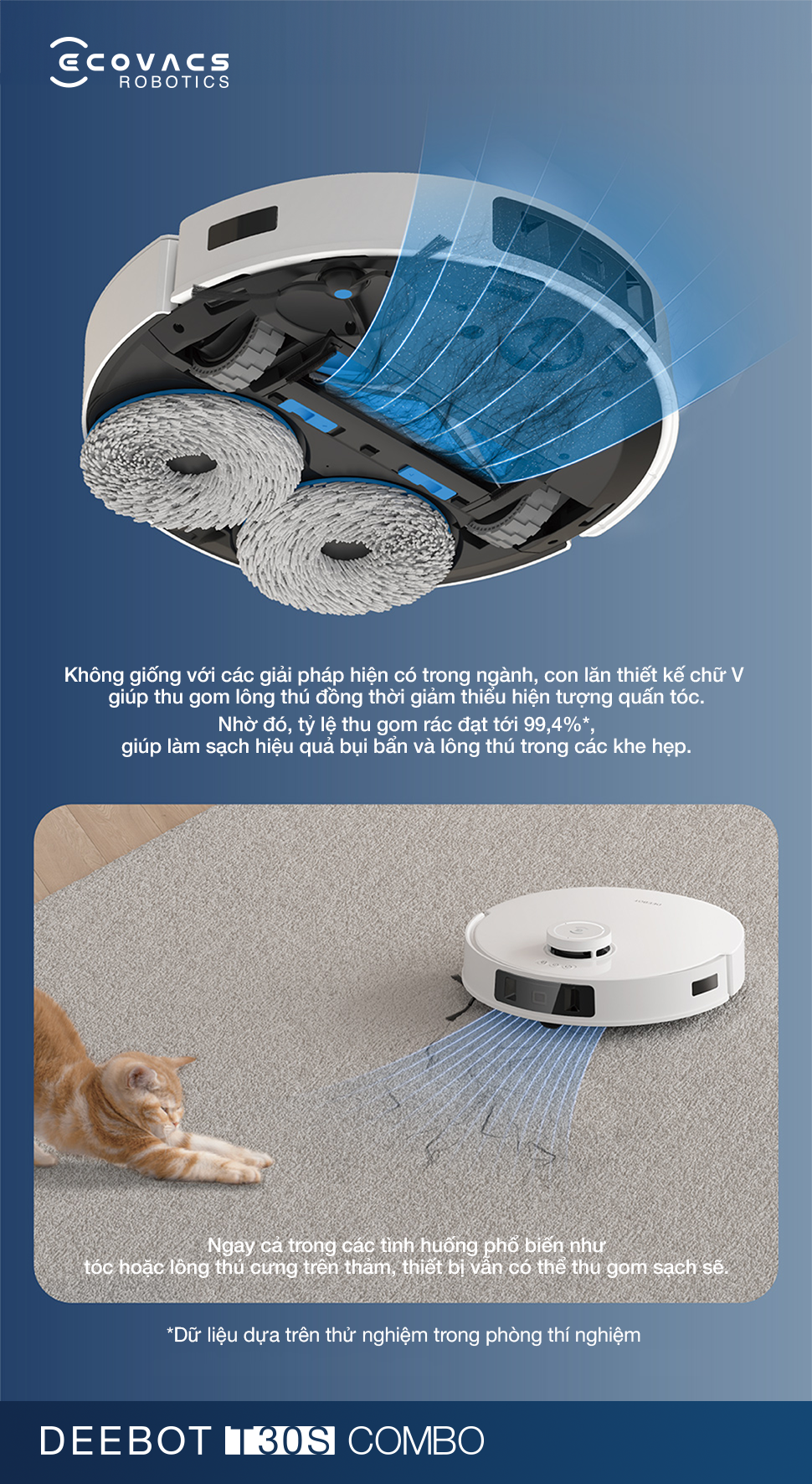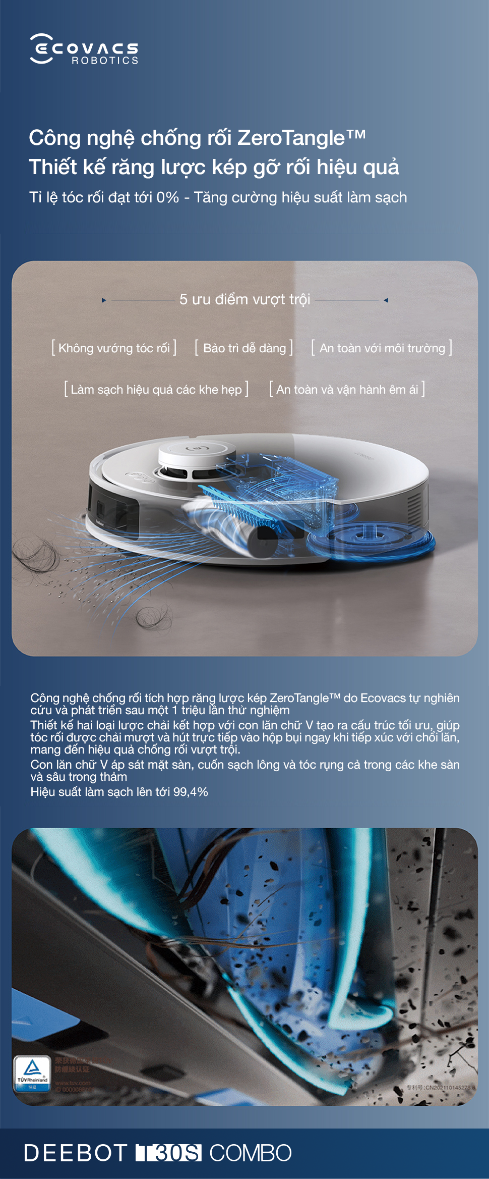 - Để nâng cao hiệu suất, chổi lăn được tích hợp thêm răng lược kép, chủ động gỡ rối và đưa thẳng lông/tóc vào cổng hút, giảm thiểu tình trạng vướng tóc và tỷ lệ tóc rối thấp tới 0%. Điều này duy trì hiệu suất hút cao, đồng thời đảm bảo vận hành an toàn và yên tĩnh.