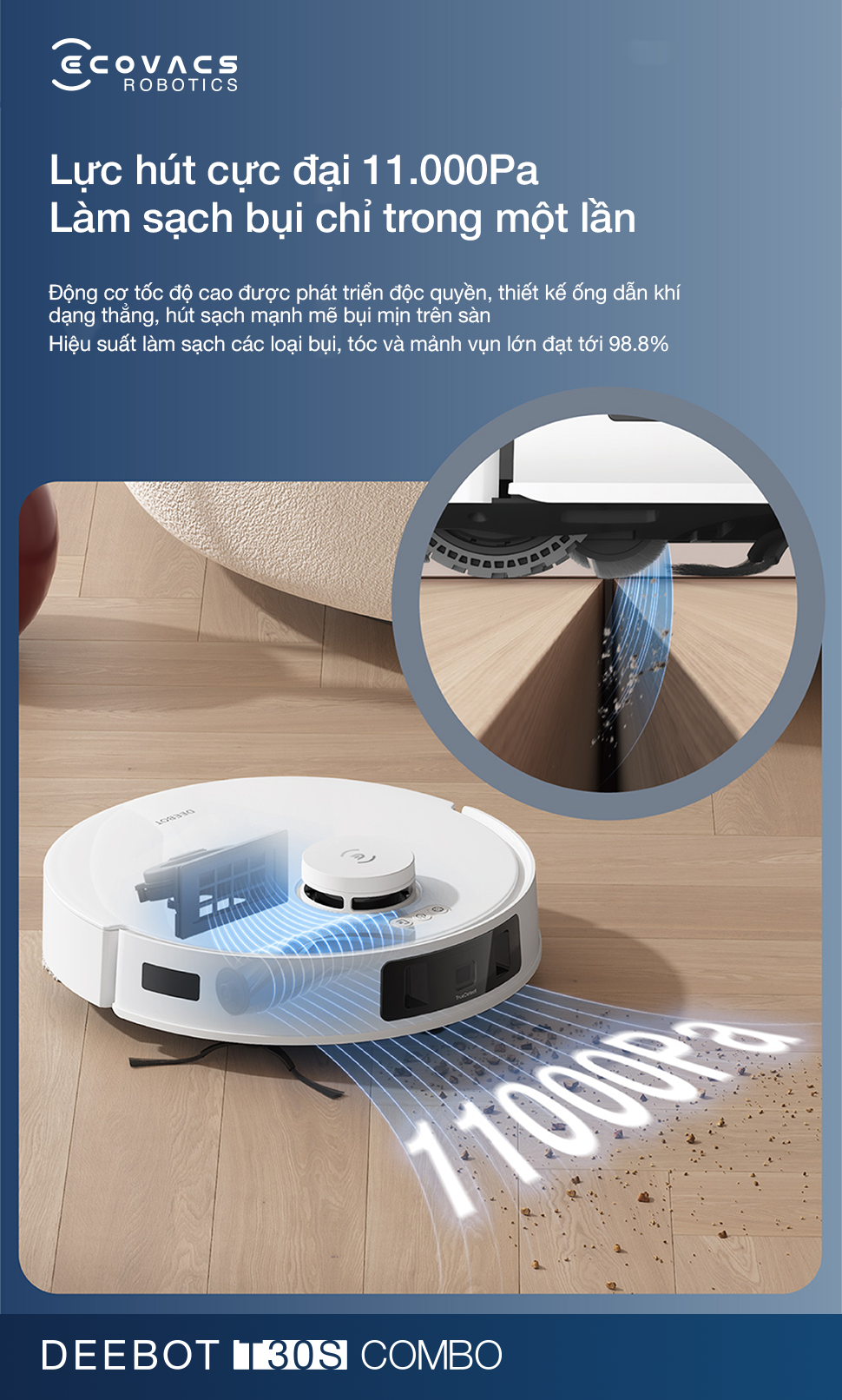 Lực hút mạnh mẽ 11.000Pa được hỗ trợ bởi động cơ tốc độ cao và thiết kế ống dẫn khí thẳng, có khả năng hút sạch bụi mịn bám sâu trong các sợi thảm hay khe sàn cứng.