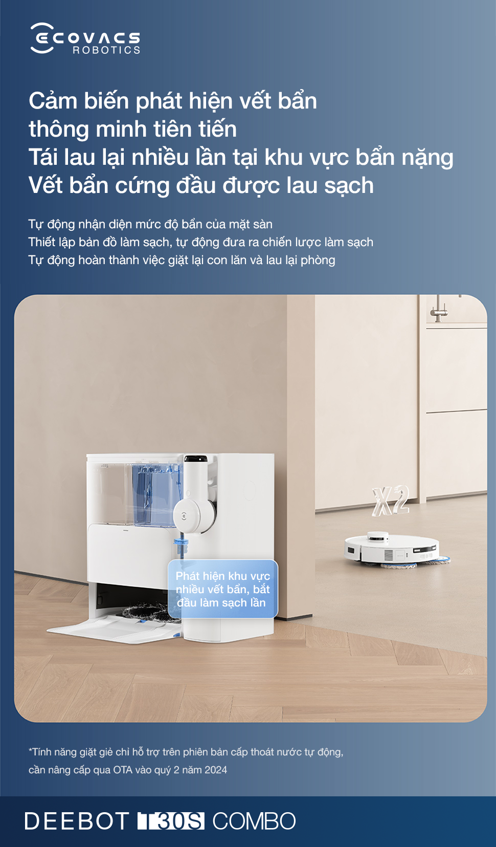 Ecovacs T30S Combo diện vết bẩn tự động, chu trình vệ sinh kép