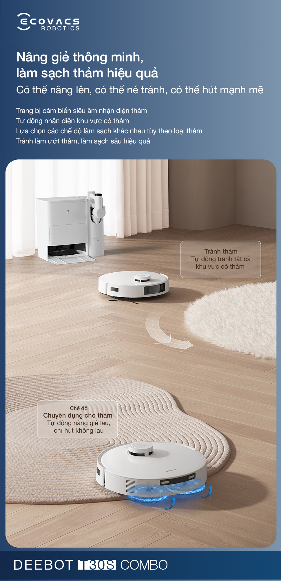 Nhờ ứng dụng công nghệ sóng siêu âm tiên tiến, robot hút bụi lau nhà Ecovacs T30S Combo có khả năng nhận diện thảm với độ chính xác cao. Ngay khi phát hiện thảm, hệ thống sẽ tự động nâng tấm lau nhà lên 9mm, đồng thời kích hoạt lực hút cực đại để làm sạch sâu bụi bẩn bám trong sợi vải.