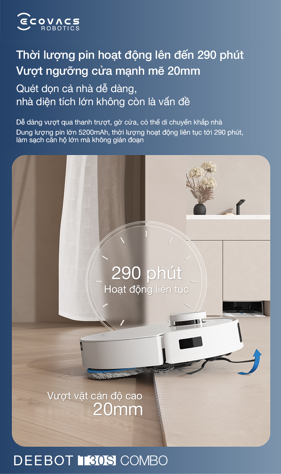 Được trang bị viên pin dung lượng lớn 5200mAh, robot hút bụi lau nhà và máy hút bụi cầm tay Ecovacs Deebot T30S Combo 2026 sở hữu khả năng vận hành bền bỉ với thời gian làm sạch liên tục lên đến 2900 phút. Chỉ với một lần sạc duy nhất, robot có thể bao phủ hoàn toàn không gian của những căn hộ rộng lớn.