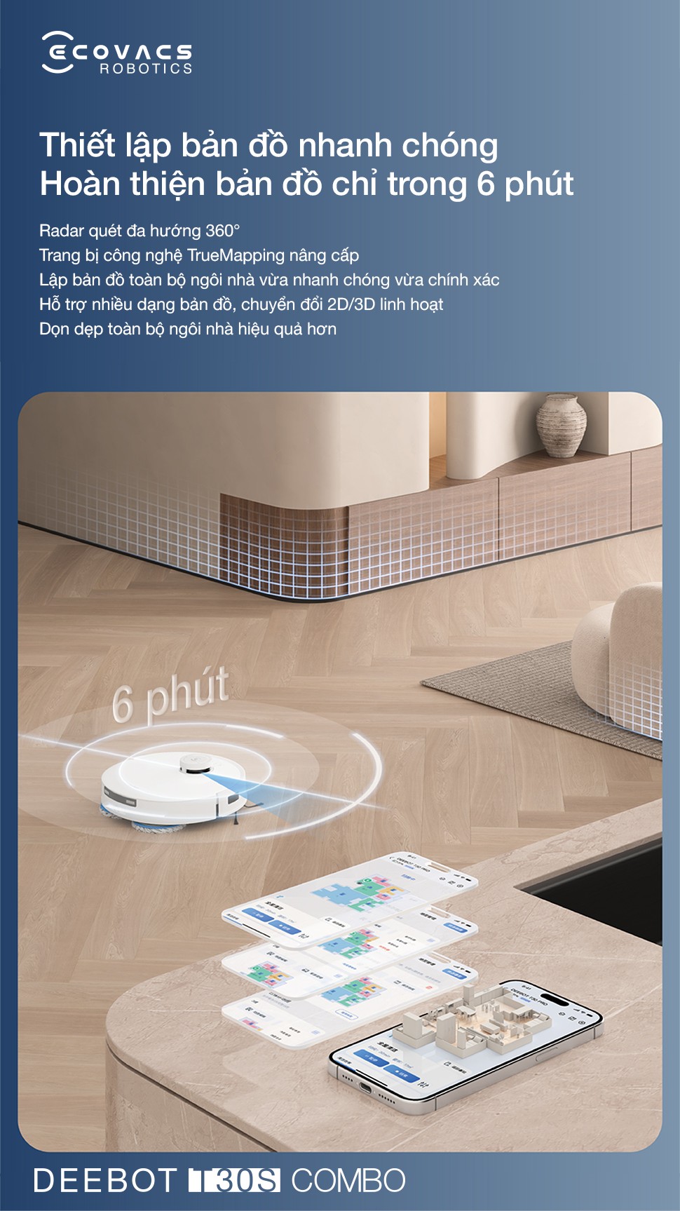 Với công nghệ TrueMapping 2.0, robobot hút bụi Ecovacs Deebot T30S Combo thể hiện khả năng lập kế hoạch đường đi cực kỳ khoa học và hiệu quả. Chỉ mất vỏn vẹn 6 phút để hoàn thành bản đồ cho diện tích 100m², robot tự tin di chuyển trong những không gian phức tạp như dưới gầm bàn ăn hay chân nội thất san sát.
